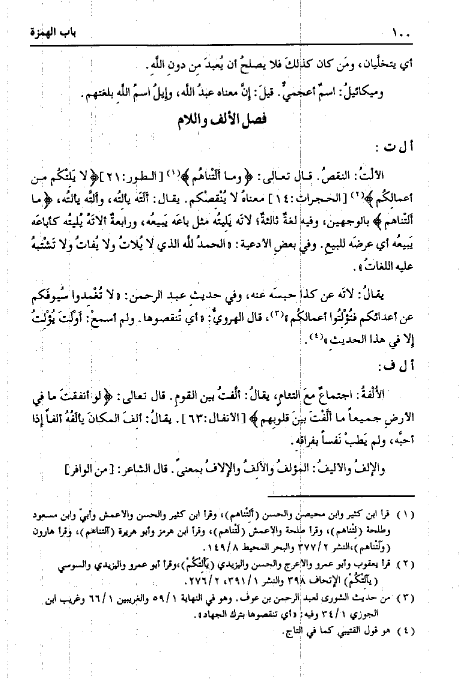 الألْتُ: النقصُ. قال تعالى: {وما أَلَتْناهُم} [الطور: 21] {لا يَلِتْكُم من أعمالِكُم} [الحجرات: 14] معناهُ لا يُنْقِصْكم. يقال: أَلَتَه يألتِهُ، وأَلتَّه يألتُه، {ما أَلتْناهم} بالوجهين، وفيه لغةٌ ثالثةٌ؛ لاتَه يَلِيتُه مثل باعَه يَبيعُه، ورابعةٌ ألاتَهُ يُليتُه كأباعَه يَبيعُه أي عرضَه للبيعِ. وفي بعضِ الأدعية: «الحمدُ لله الذي لا يُلاتُ ولا يُفاتُ ولا تَشْتبهُ عليه اللغاتُ».