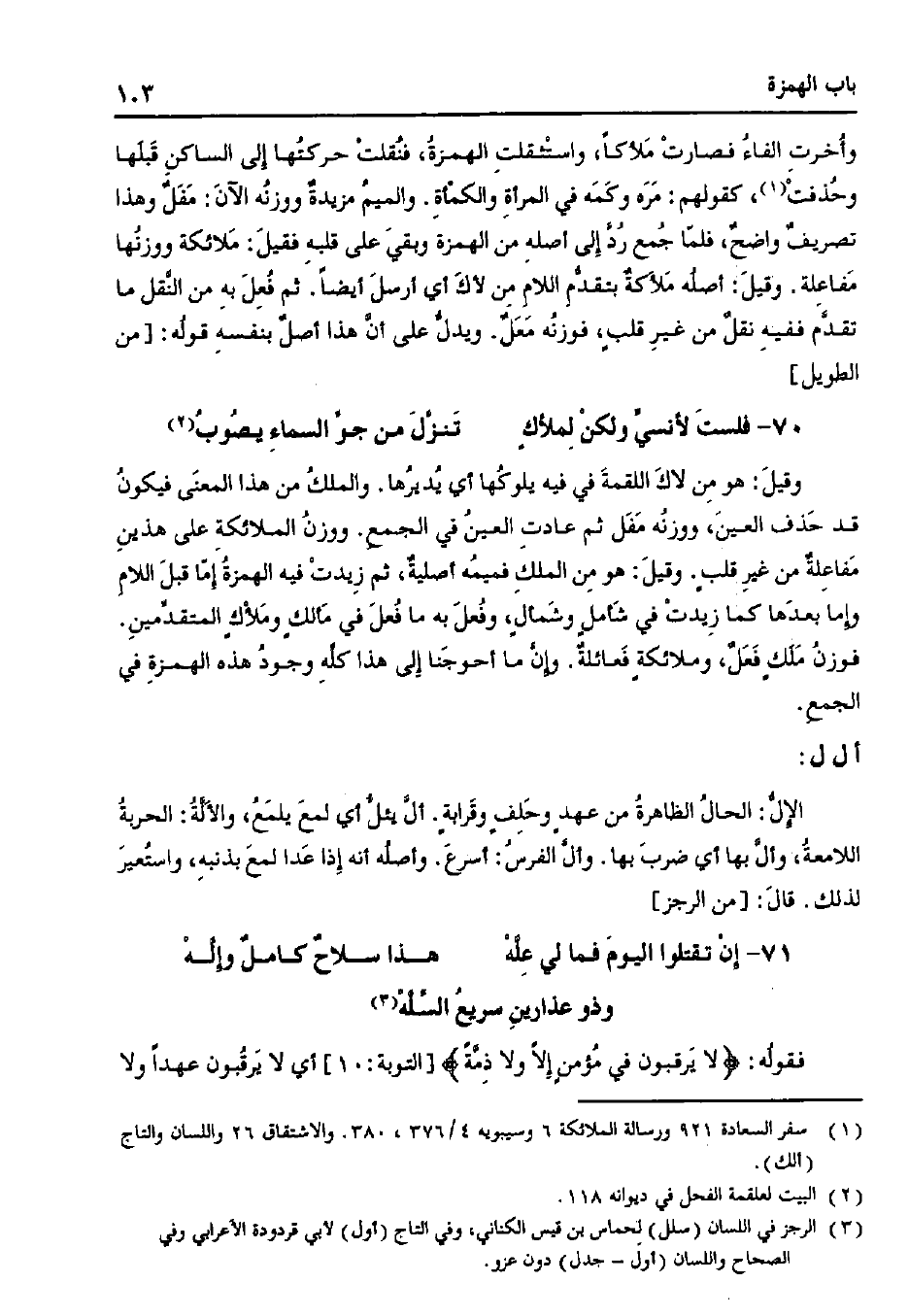 وأخرت الفاء فصارت ملأكًا، واستثقلت الهمزة، فنقلت حركتها إلى الساكن قبلها وحذفت، كقولهم: مره وكمه في المرأة والكمأة. والميم مزيدًة ووزنه الآن: مفل وهذا تصريف واضح، فلما جمع رد إلى أصله من الهمزة وبقي على قلبه فقيل: ملائكة ووزنها مفاعلة. وقيل: أصله ملأكة بتقدم اللام من لأك أي أرسل أيضًا. ثم فعل به من النقل ما تقدم ففيه نقل من غير قلبٍ، فوزنه معل. ويدل على أن هذا أصل بنفسه قوله: [من الطويل]