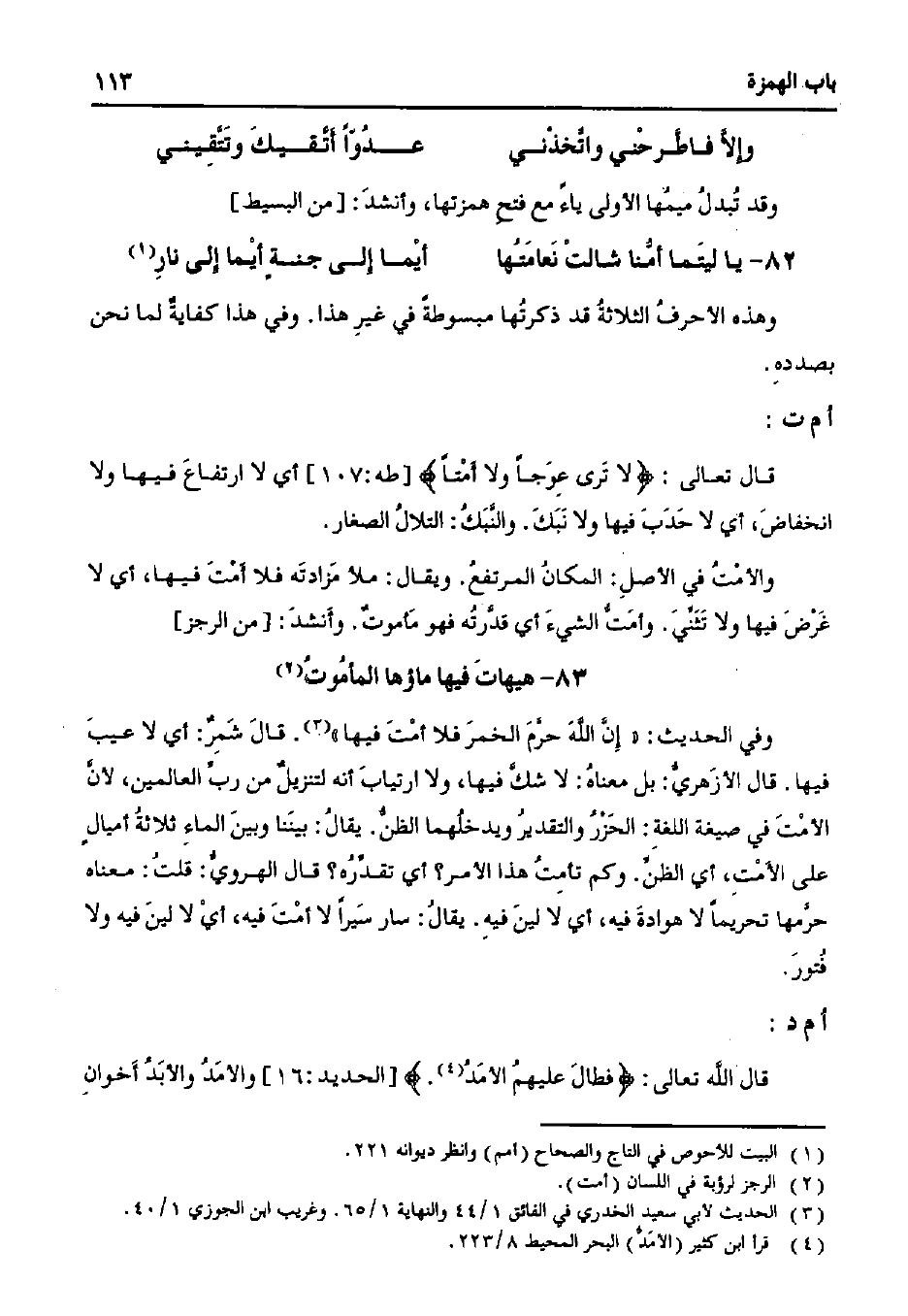 وفي الحديث: "إن الله حرام الخمر فلا أمت فيها". قال شمر: أي لا عيب فيها. قال الأزهري: بل معناه: لا شك فيها، ولا ارتياب أنه لتنزيل من رب العالمين، لأن الأمت في صيغة اللغة: الحزر والتقدير ويدخلهما الظن. يقال: بيننا وبين الماء ثلاثة أميالٍ على الأمت، أي الظن. وكم تأمت هذا الأمر؟ أي تقدره؟ قال الهروي: قلت: معناه حرمها تحريمًا لا هوادة فيه، أي لا لين فيه. يقال: سار سيرًا لا أمت فيه، أي لا لين فيه ولا فتور.