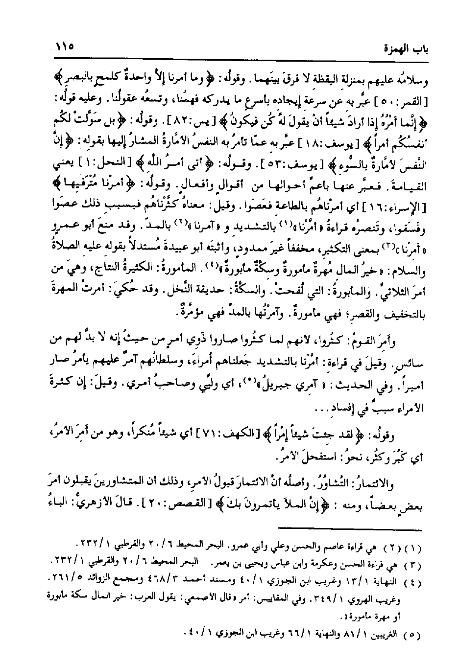 وسلامه عليهم بمنزلة اليقظة لا فرق بينهما. وقوله:} وما أمرنا إلا واحدة كلمحٍ بالبصر [[القمر: 50] عبر به عن سرعة إيجاده بأسرع ما يدركه فهمنا، وتسعه عقولنا. وعليه قوله:} إنما أمره إذا أراد شيئًا أن يقول له كن فيكون {[يس: 82]. وقوله:} بل سولت لكم أنفسكم أمرًا {[يوسف: 18] عبر به عما تأمر به النفس الأمارة المشار إليها بقوله:} إن النفس لأمارة بالسوء {[يوسف: 53]. وقوله:} أتى أمر الله {[النحل: 1] يعني القيامة. فعبر عنها بأعم أحوالها من أقوالٍ وأفعالٍ. وقوله:} أمرنا مترفيها {[الإسراء: 16] أي أمرناهم بالطاعة فعصوا. وقيل: معناه كثرناهم فبسبب ذلك عصوا وفسقوا، وتنصره قراءة "أمرنا" بالتشديد و"آمرنا" بالمد. وقد منع أبو عمروٍ "أمرنا" بمعنى التكثير، مخففًا غير ممدودٍ، وأثبته أبو عبيدة مستدلاً بقوله عليه الصلاة والسلام: "خير المال مهرة مأمورة وسكة مأبورة". المأمورة: الكثيرة النتاج، وهي من أمر الثلاثي. والمأبورة: التي لقحت. والسكة: حديقة النخل. وقد حكي: أمرت المهرة بالتخفيف والقصر؛ فهي مأمورة. وآمرتها بالمد فهي مؤمرة.