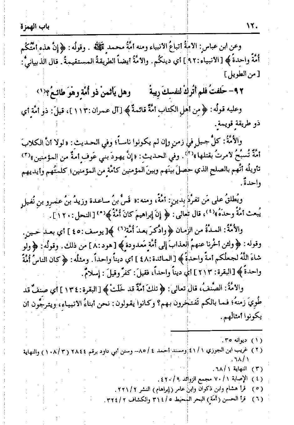 وعن ابن عباسٍ: الأمة أتباع الأنبياء ومنه أمة محمدٍ صلى الله عليه وسلم. وقوله:} إن هذه أمتكم أمًة واحدًة {[الأنبياء: 92] أي دينكم. والأمة أيضًا الطريقة المستقيمة. قال الذبياني: [من الطويل].