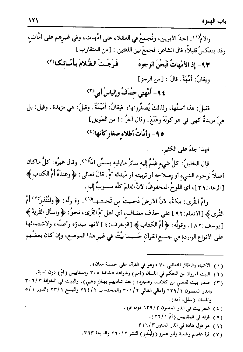 قال الخليل: كل شيءٍ ضم إليه سائر ما يليه يسمي أمًا. وقال غيره: كل ما كان أصلاً لوجود الشيء أو إصلاحه أو تربيته أو مبدئه أم. قال تعالى:} وعنده أم الكتاب {[الرعد: 39]، أي اللوح المحفوظ، لأن العلم كله منسوب إليه.