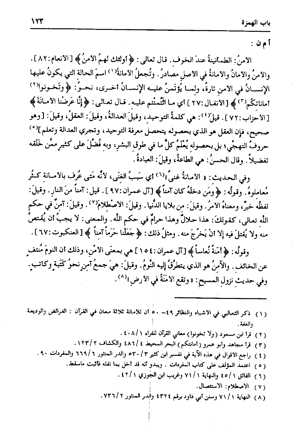 الأمن: الطمأنينة عند الخوف. قال تعالى:} أولئك لهم الأمن {[الأنعام: 82]. والأمن والأمان والأمانة في الأصل مصادر. وتجعل الأمانة اسم الحالة التي يكون عليها الإنسان في الأمن تارًة، ولما يؤتمن عليه الإنسان أخرى، نحو:} وتخونوا أماناتكم {[الأنفال: 27] أي ما ائتمنتم عليه. قال تعالى:} إنا عرضنا الأمانة {[الأحزاب: 72]. قيل: هي كلمة التوحيد، وقيل العدالة، وقيل: العقل، وقيل: [وهو صحيح، فإن العقل هو الذي بحصوله يتحصل معرفة التوحيد، وتجري العدالة وتعلم] حروف التهجي؛ بل بحصوله يعلم كل ما في طوق البشر، وبه فضل على كثيرٍ ممن خلقه تفضيلاً. وقال الحسن: هي الطاعة، وقيل: العبادة.