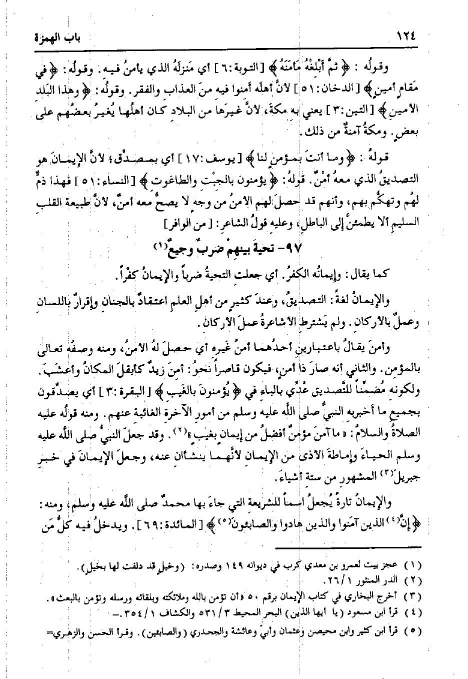 قوله:} وما أنت بمؤمنٍ لنا {[يوسف: 17] أي بمصدق؛ لأن الإيمان هو التصديق الذي معه أمن. قوله:} يؤمنون بالجبت والطاغوت {[النساء: 51] فهذا ذم لهم وتهكم بهم، وأنهم قد حصل لهم الأمن من وجهٍ لا يصح معه أمن، لأن طبيعة القلب السليم ألا يطمئن إلى الباطل، وعليه قول الشاعر: [من الوافر]