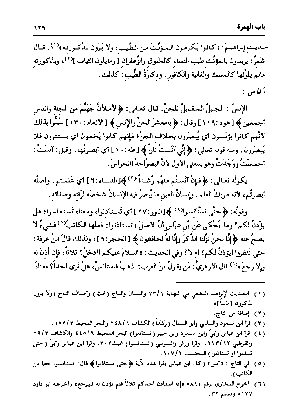 وقوله:} حتى تستأنسوا {[النور: 27] أي تستأذنوا، ومعناه تستعلموا؛ هل يؤذن لكم؟ وما يحكي عن ابن عباسٍ أن الأصل "تستأذنوا" فعلها الكاتب فشيء لا يصح عنه} إنا نحن نزلنا الذكر وإنا له لحافظون {[الحجر: 9]، ولذلك قال ابن عرفة: حتى تنظروا أيؤذن لكم؟ أم لا؟ وفي الحديث: "السلام عليكم أأدخل؟ ثلاثًا، فإن أذن له وإلا رجع" قال الأزهري: من يقول من العرب: اذهب فاستأنس، هل ترى أحدًا؟ معناه