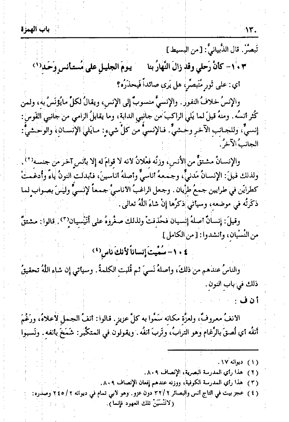 والإنسان مشتق من الأنس، وزنه فعلان لأنه لا قوام له إلا بأنسٍ آخر من جنسه. ولذلك قيل: الإنسان مدني، وجمعه أناسي وأصله أناسين، فأبدلت النون ياًء وأدغمت كطراين في طرايين جمع طريان. وجعل الراغب الأناسي جمعًا لإنسي وليس بصوابٍ لما ذكرته في موضعه، وسيأتي ذكرها إن شاء الله تعالى.