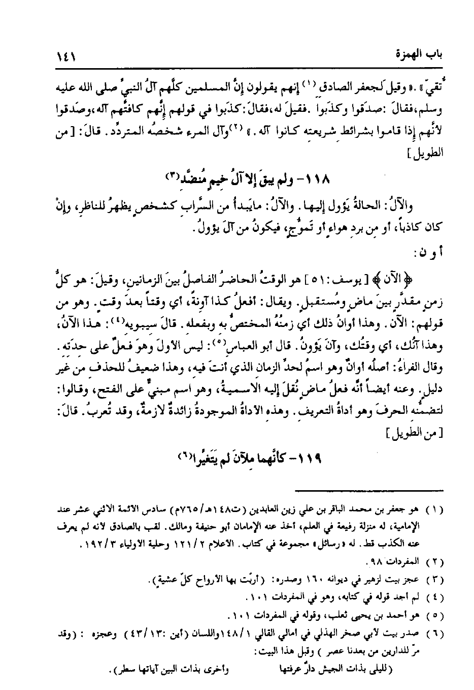 تقي". "وقيل لجعفر الصادق إنهم يقولون إن المسلمين كلهم آل النبي صلى الله عليه وسلم، فقال: صدقوا وكذبوا. فقيل له، فقال: كذبوا في قولهم إنهم كافتهم آله، وصدقوا لأنهم إذا قاموا بشرائط شريعته كانوا آله." وآل المرء شخصه المتردد. قال: [من الطويل]