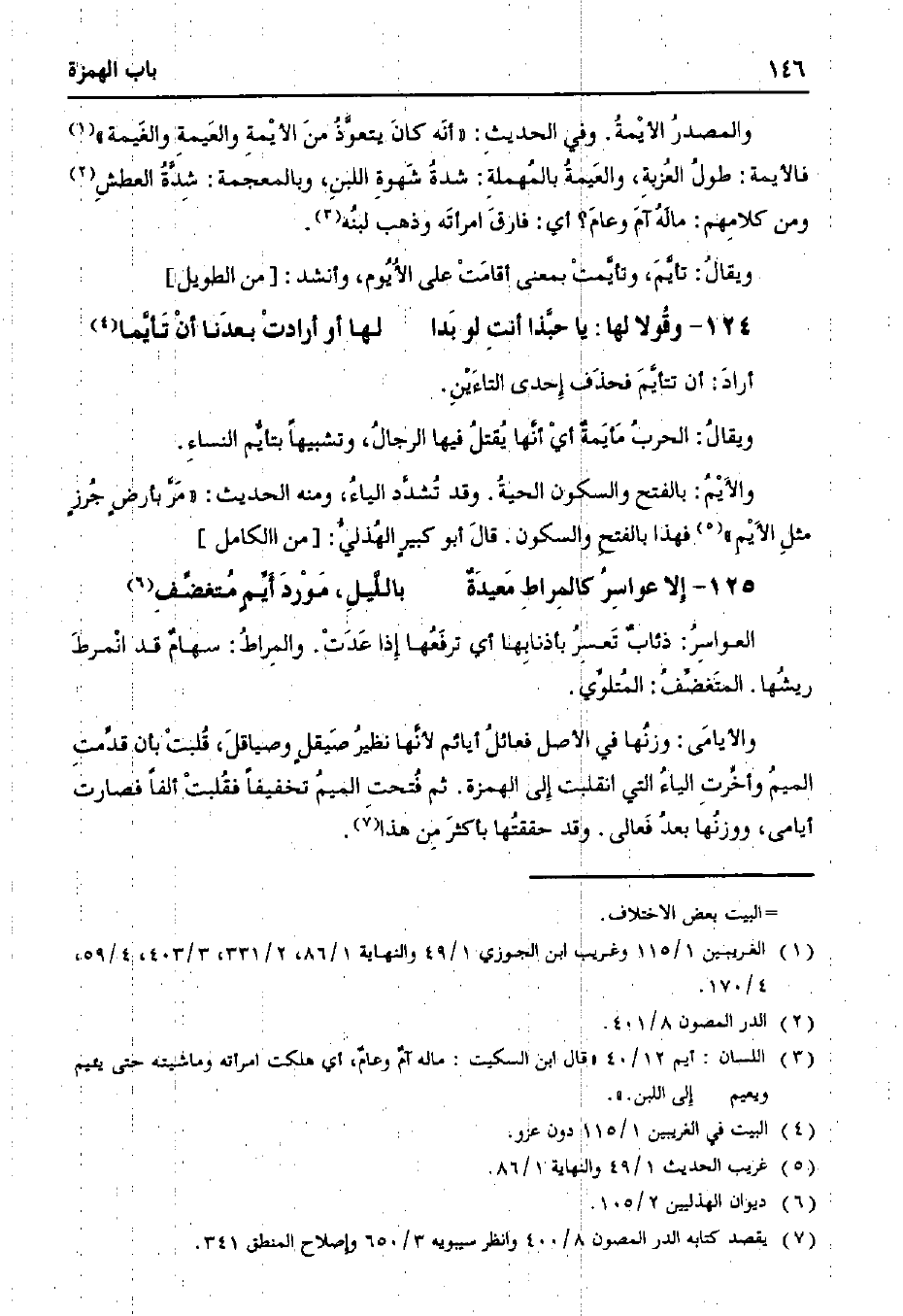 والأيامي: وزنها في الأصل فعائل أيائم لأنها نظير صيقلٍ وصياقل، قلبت بأن قدمت الميم وأخرت الياء التي انقلبت إلى الهمزة. ثم فتحت الميم تخفيفًا فقلبت ألفًا فصارت أيامي، ووزنها بعد فعالي. وقد حققتها بأكثر من هذا.