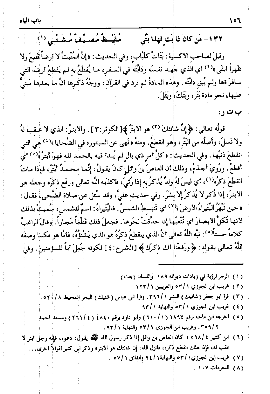 وقيل لصاحب الأكسية: بتات كلبابٍ، وفي الحديث: "إن المنبت لا أرضًا قطع ولا ظهرًا أبقى" أي الذي جهد نفسه ودابته في السفر، ما يقطع به لم يقطع أرضه التي سافرةها ولم يبق دابته. وهذه المادة لم ترد في القرآن، ووجه ذكرها أن ما بعدها مبني عليها، نحو مادة بتر، وتبك، وبتل.