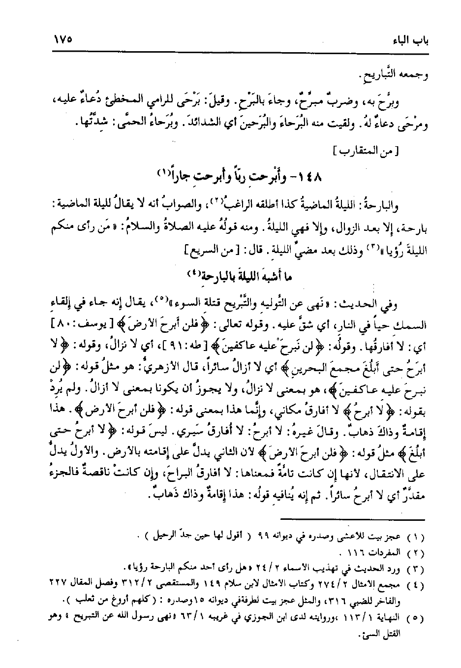 وفي الحديث: "نهي عن التوليه والتبريح قتلة السوء"، يقال إنه جاء في إلقاء السمك حيًا في النار، أي شق عليه. وقوله تعالى:} فلن أبرح الأرض {[يوسف: 80] أي: لا أفارقها. وقوله:} لن نبرح عليه عاكفين {[طه: 91]، أي لا نزال، وقوله:} لا أبرح حتى أبلغ مجمع البحرين {أي لا أزال سائرًا، قال الأزهري: هو مثل قوله:} لن نبرح عليه عاكفين {، هو بمعنى لا نزال، ولا يجوز أن يكونا بمعنى لا أزال. ولم يرد بقوله:} لا أبرح {لا أفارق مكاني، وإنما هذا بمعنى قوله:} فلن أبرح الأرض {. هذا إقامة وذاك ذهاب. وقال غيره: لا أبرح: لا أفارق سيري. ليس قوله:} لا أبرح حتى أبلغ {مثل قوله:} فلن أبرح الأرض {لأن الثاني يدل على إقامته بالأرض. والأول يدل على الانتقال، لأنها إن كانت تامًة فمعناها: لا أفارق البراح، وإن كانت ناقصة فالجزء مقدر أي لا أبرح سائرًا. ثم إنه ينافيه قوله: هذا إقامة وذاك ذهاب.