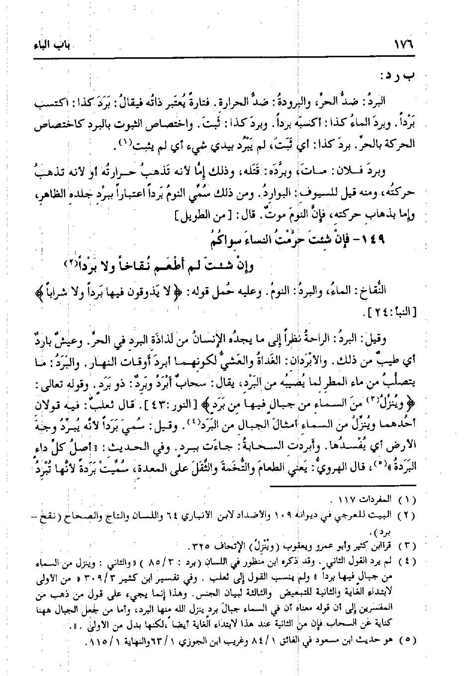 البرد: ضد الحر، والبرودة: ضد الحرارة. فتارًة يعتبر ذاته فيقال: برد كذا: اكتسب بردًا. وبرد الماء كذا: أكسبه بردًا. وبرد كذا: ثبت. واختصاص الثبوت بالبرد كاختصاص الحركة بالحر. برد كذا: أي ثبت، لم يبرد بيدي شيء أي لم يثبت.