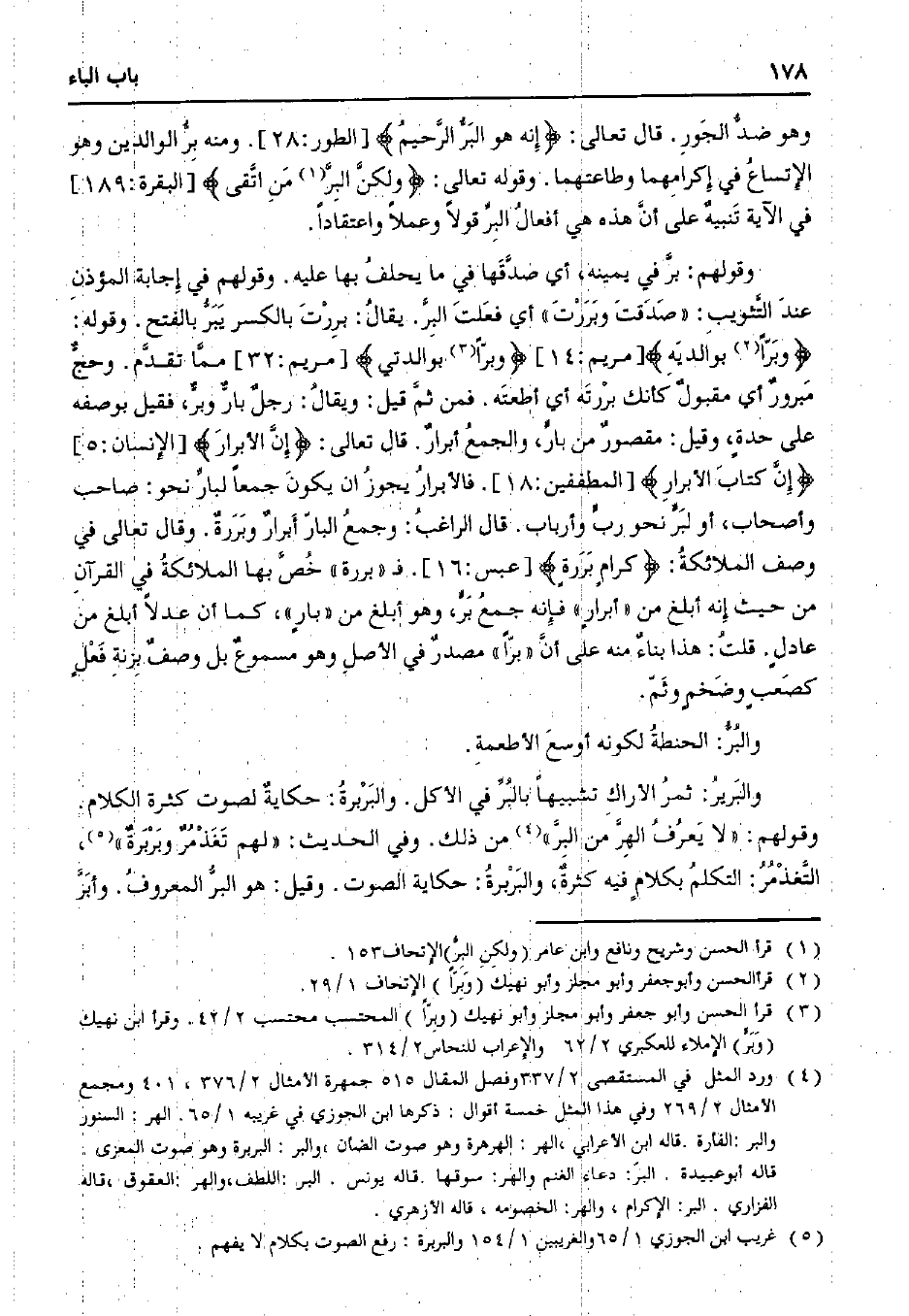 وقولهم: بر في يمينه، أي صدقها في ما يحلف بها عليه. وقولهم في إجابة المؤذن عند التئويب: "صدقت وبررت" أي فعلت البر. يقال: بررت بالكسر يبر بالفتح. وقوله:} وبرًا بوالديه {[مريم: 14]} وبرًا بوالدتي {[مريم: 32] مما تقدم. وحج مبرور أي مقبول كأنك بررته أي أطعته. فمن ثم قيل: ويقال: رجل بار وبر، فقيل بوصفه على حدة، وقيل: مقصور من بارٌ، والجمع أبرار. قال تعالى:} إن الأبرار {[الإنسان: 5]} إن كتاب الأبرار {[المطففين: 18]. فالأبرار يجوز أن يكون جمعًا لبار نحو: صاحب وأصحاب، أو لبر نحو رب وأرباب. قال الراغب: وجمع البار أبرار وبررة. وقال تعالى في وصف الملائكة:} كرامٍ بررةٍ {[عبس: 16]. فـ"بررة" خص بها الملائكة في القرآن من حيث إنه أبلغ من "أبرار" فإنه جمع بر، وهو أبلغ من "بارٍ"، كما أن عدلاً أبلغ من عادلٍ. قلت: هذا بناء منه على أن "برًا" مصدر في الأصل وهو مسموع بل وصف بزنة فعلٍ كصعبٍ وضخمٍ وثم.
