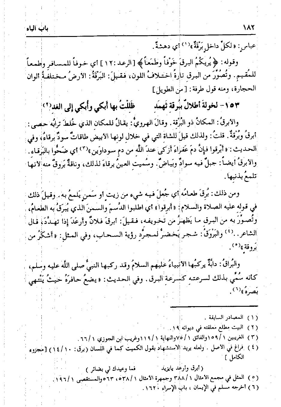 ومن ذلك: برق طعامه أي جعل فيه شيء من زيتٍ أو سمنٍ يلمع به. وقيل ذلك في قوله عليه الصلاة والسلام: "أبرقوا" أي اطلبوا الدسم والسمن الذي يبرق به الطعام، وتصور به من البرق ما يظهر من تخويفه، فقيل: أبرق فلان وأرعد إذا تهدد، قال الشاعر .. والبروق: شجر يخضر لمجرد رؤية السحاب، وفي المثل: "أشكر من بروقةٍ".