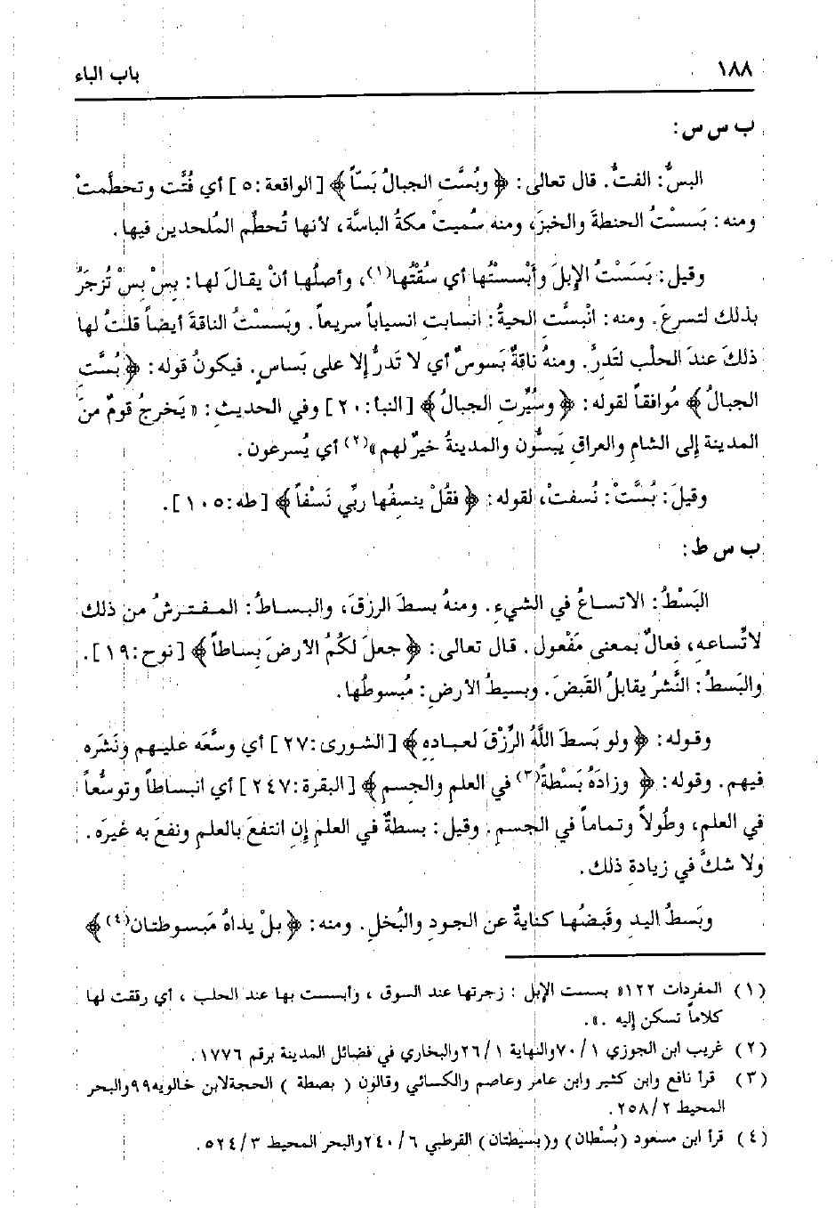 وقوله:} ولو بسط الله الرزق لعباده {[الشورى: 27] أي وسعه عليهم ونشره فيهم. وقوله:} وزاده بسطًة في العلم والجسم {[البقرة: 247] أي انبساطًا وتوسعًا في العلم، وطولاً وتمامًا في الجسم. وقيل: بسطة في العلم إن انتفع بالعلم ونفع به غيره. ولا شك في زيادة ذلك.