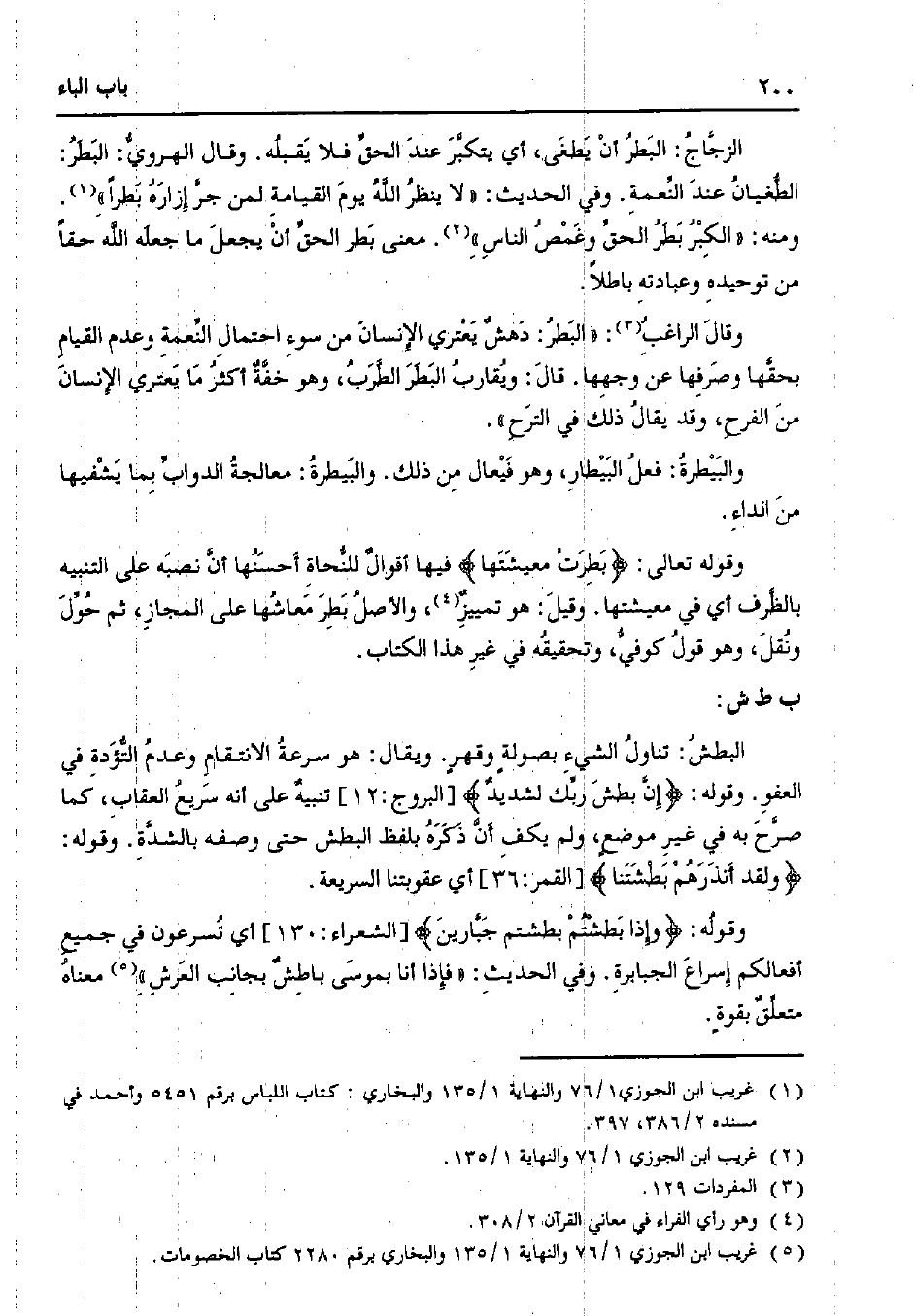 الزجَّاج: البطر أن يطغى، أي يتكبر عند الحق فلا يقبله. وقال الهروي: البطر: الطغيان عند النعمة. وفي الحديث: "لا ينظر الله يوم القيامة لمن جر إزاره بطرًا". ومنه: "الكبر بطر الحق وغمص الناس". معنى بطر الحق أن يجعل ما جعله الله حقًا من توحيده وعبادته باطلاً.