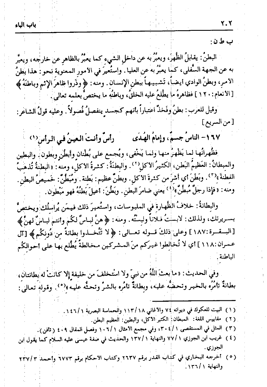 البطن: يقابل الظهر، ويعبر به عن داخل الشيء كما يعبر بالظاهر عن خارجه، ويعبر به عن الجهة السفلى، كما يعبر به عن العليا. واستعير في الأمور المعنوية نحو: هذا بطن الأمر، وبطن الوادي أيضًا، تشبيهًا ببطن الإنسان. ومنه:} وذروا ظاهر الإثم وباطنه {[الأنعام: 120] فظاهره ما يطلع عليه الخلق، وباطنه ما يختص بعلمه تعالى.