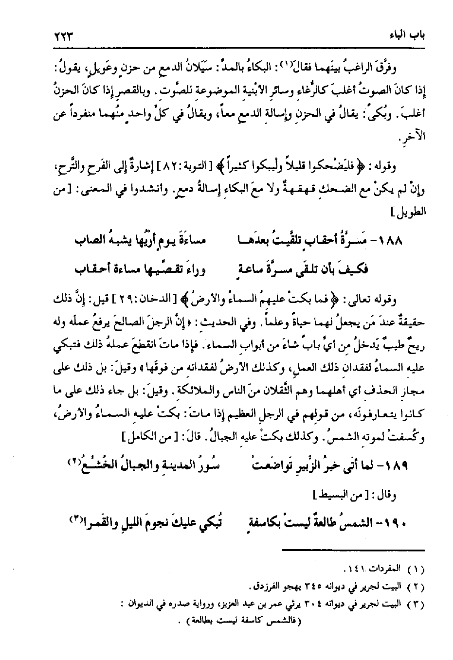 وقوله تعالى:} فما بكت عليهم السماء والأرض {[الدخان: 29] قيل: إن ذلك حقيقة عند من يجعل لهما حياًة وعلمًا. وفي الحديث: "إن الرجل الصالح يرفع عمله وله ريح طيب يدخل من أي باب شاء من أبواب السماء. فإذا مات انقطع عمله ذلك فتبكي عليه السماء لفقدان ذلك العمل، وكذلك الأرض لفقداته من فوقها" وقيل: بل ذلك على مجاز الحذف أي اهلهما وهم الثقلان من الناس والملائكة. وقيل: بل جاء ذلك على ما كانوا يتعارفونه، من قولهم في الرجل العظيم إذا مات: بكت عليه السماء والأرض، وكسفت لموته الشمس. وكذلك بكت عليه الجبال. قال: [من الكامل]