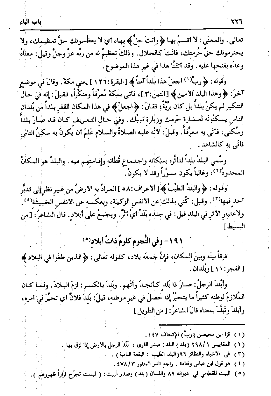 وقوله:} رب اجعل هذا بلدًا آمنًا {[البقرة: 126] يعني مكة. وقال في موضعٍ آخر:} وهذا البلد الأمين {[التين: 3]، فأتى بمكة معرفًا ومنكرًا، فقيل: إنه في حال التنكير لم يكن بلدًا بل كان بريًة، فقال:} اجعل {في هذا المكان القفر بلدًا من بلدان الناس يسكنونه لعمارةٍ حرمك وزيارة نبيك. وفي حال التعريف كان قد صار بلدًا وسكنى، فأتى به معرفًا. وقيل: لأنه عليه الصلاة والسلام علم أن يكون به سكن الناس فأتى به كالشاهد.