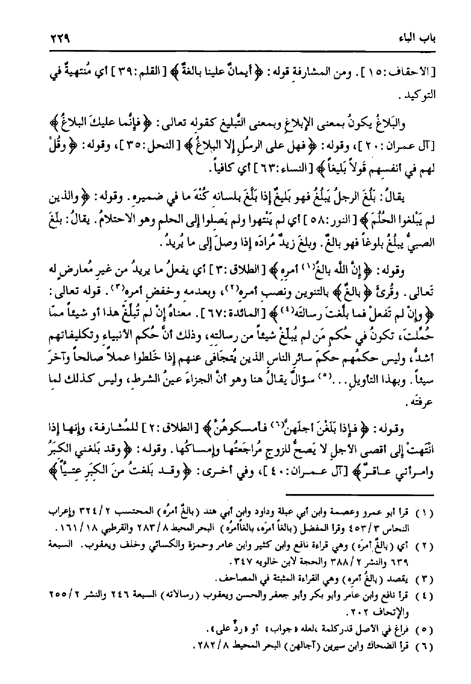 وقوله:} إن الله بالغ أمره {[الطلاق: 3] أي يفعل ما يريد من غير معارضٍ له تعالى. وقرئ} بالغ {بالتنوين ونصب أمره، وبعدمه وخفض أمره. قوله تعالى:} وإن لم تفعل فما بلغت رسالته {[المائدة: 67]. معناه إن لم تبلغ هذا أو شيئًا مما حملت، تكون في حكم من لم يبلغ شيئًا من رسالته، وذلك أن حكم الأنبياء وتكليفاتهم أشد، وليس حكمهم حكم سائر الناس الذين يتجافى عنهم إذا خلطوا عملاً صالحًا وآخر سيئًا. وبهذا التأويل ... سؤال يقال هنا وهو أن الجزاء عين الشرط، وليس كذلك لما عرفته.