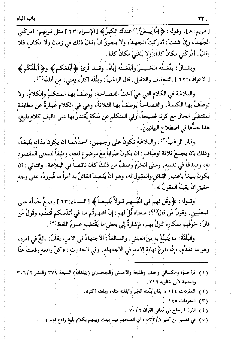 وقال الراغب: والبلاغة تكون على وجهين: أحدهما أن يكون بذاته بليغًا، وذلك بأن يجمع ثلاثة أوصافٍ: أن يكون صوابًا مع موضوع لغته، وطبقًا للمعنى المقصود به، وصدقًا في نفسه. ومتى انخرم وصف من ذلك كان ناقصًا في البلاغة. والثاني: أن يكون بليغًا باعتبار القائل والمقول له، وهو أن يقصد القائل به أمرًا ما فيورده على وجهٍ حقيقٍ أن يقبله المقول له.