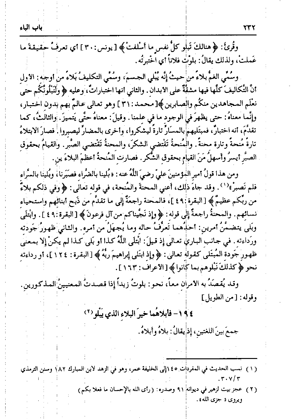 ومن هذا قول أمير المؤمنين علي رضي الله عنه: "بلينا بالضراء فصبرنا، وبلينا بالسراء فلم نصبر". وقد جاء ذلك، أعني المحنة والمنحة، في قوله تعالى:} وفي ذلكم بلاء من ربكم عظيم {[البقرة: 49]، فالمحنة راجعة إلى ما تقدم من ذبح أبنائهم واستحياء نسائهم. والمحنة راجعة إلى قوله:} وإذ نجيناكم من آل فرعون {[البقرة: 49]. وابتلى وبلى يتضمن أمرين: أحدهما تعرف حاله وما يجهل من أمره. والثاني ظهور جودته ورداءته. في جانب الباري تعالى إذ قيل: ابتلى الله كذا أو بلى كذا لم يكن إلا بمعنى ظهور جودة المبتلى كقوله تعالى:} وإذ ابتلى إبراهيم ربه {[البقرة: 124]، أو رداءته نحو} كذلك نبلوهم بما كانوا {[الأعراف: 163].