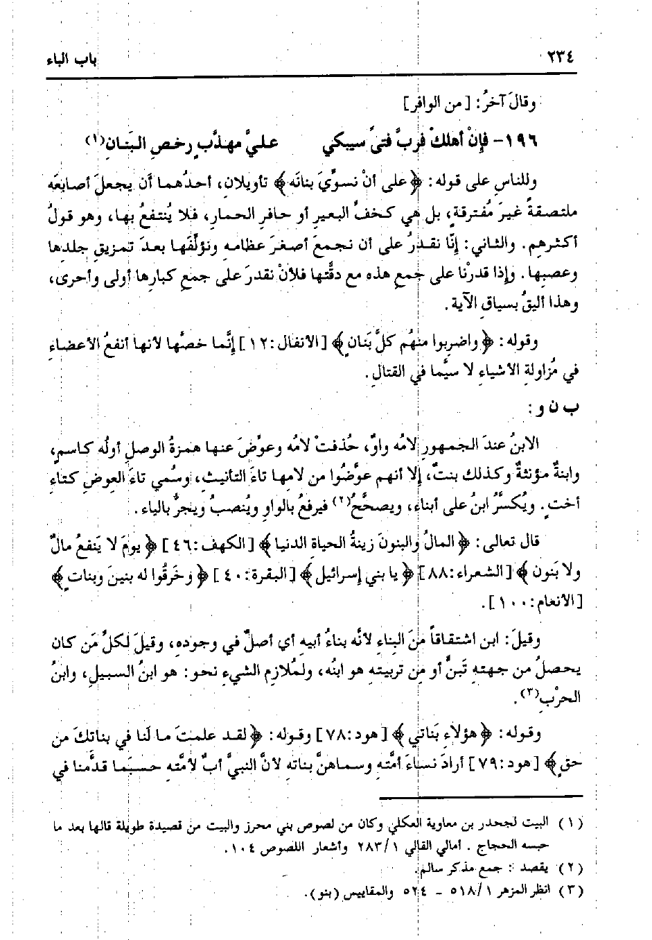 وقيل: ابن اشتقاقًا من البناء لأنه بناء أبيه أي أصل في وجوده، وقيل لكل من كان يحصل من جهته تبن أو من تربيته هو ابنه، ولملازم الشيء نحو: هو ابن السبيل، وابن الحرب.