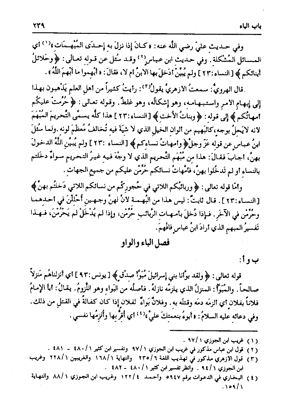 وأما قوله تعالى:} وربائبكم اللاتي في حجوركم من نسائكم اللاتي دخلتم بهن {[النساء: 23]. قال ثابت: ليس هذا من البهمة لأن لهن وجهين أحللن في أحدهما وحرمن في الآخر. فإذا دخل بأمهات الربائب حرمن، وإذا لم يدخل لم يحرمن، فهذا تفسير المبهم الذي أراد ابن عباسٍ فافهم.