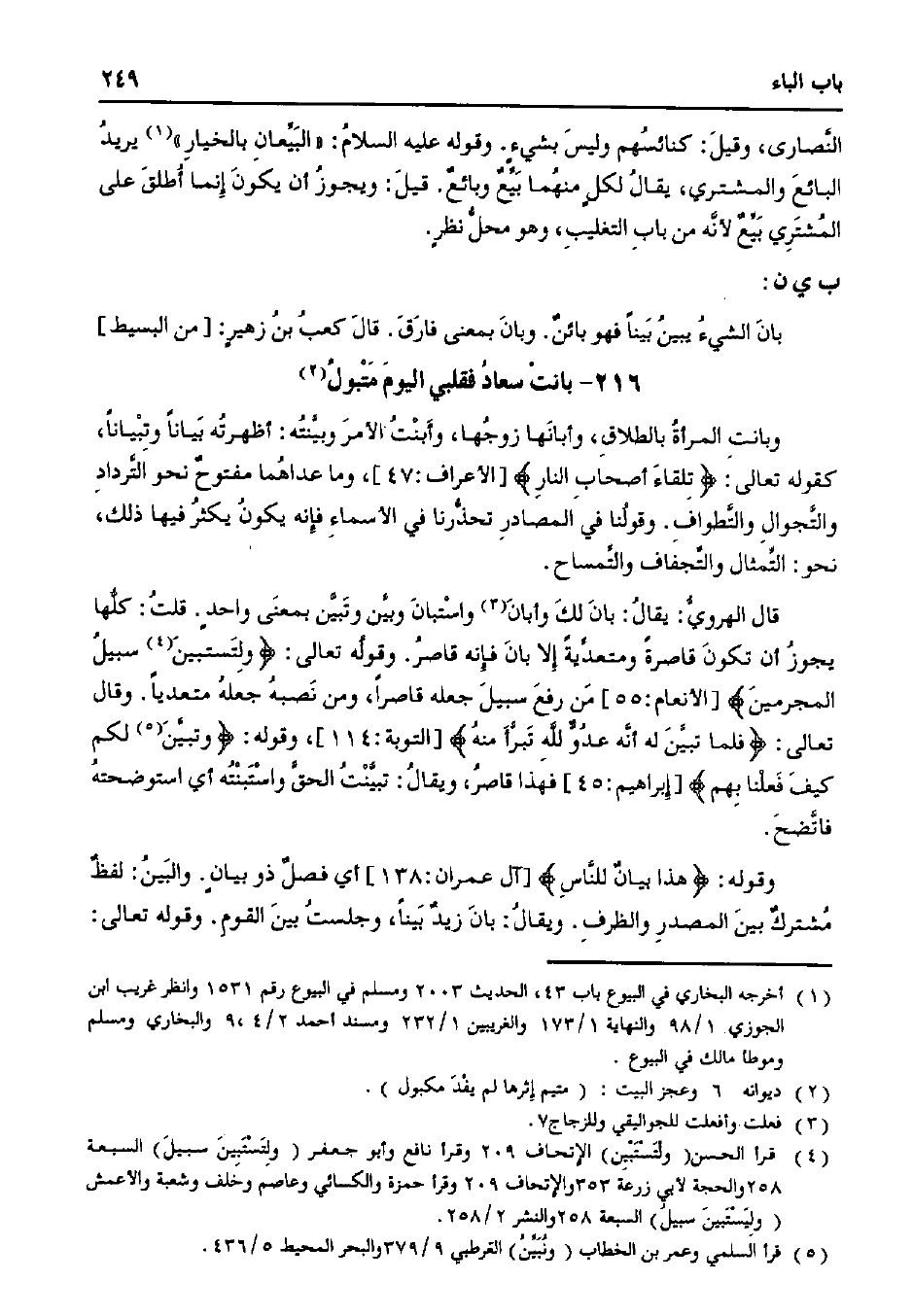 قال الهروي: يقال: بان لك وأبان واستبان وبين وتبين بمعنى واحدٍ. قلت: كلها يجوز أن تكون قاصرًة ومتعديًة إلا بان فإنه قاصر. وقوله تعالى:} ولتستبين سبيل المجرمين {[الأنعام: 55] من رفع سبيل جعله قاصرًا، ومن نصبه جعله متعديًا. وقال تعالى:} فلما تبين له أنه عدو لله تبرأ منه {[التوبة: 114]، وقوله:} وتبين لكم كيف فعلنا بهم {[إبراهيم: 45] فهذا قاصر، ويقال: تبينت الحق واستبنته أي استوضحته فاتضح.
