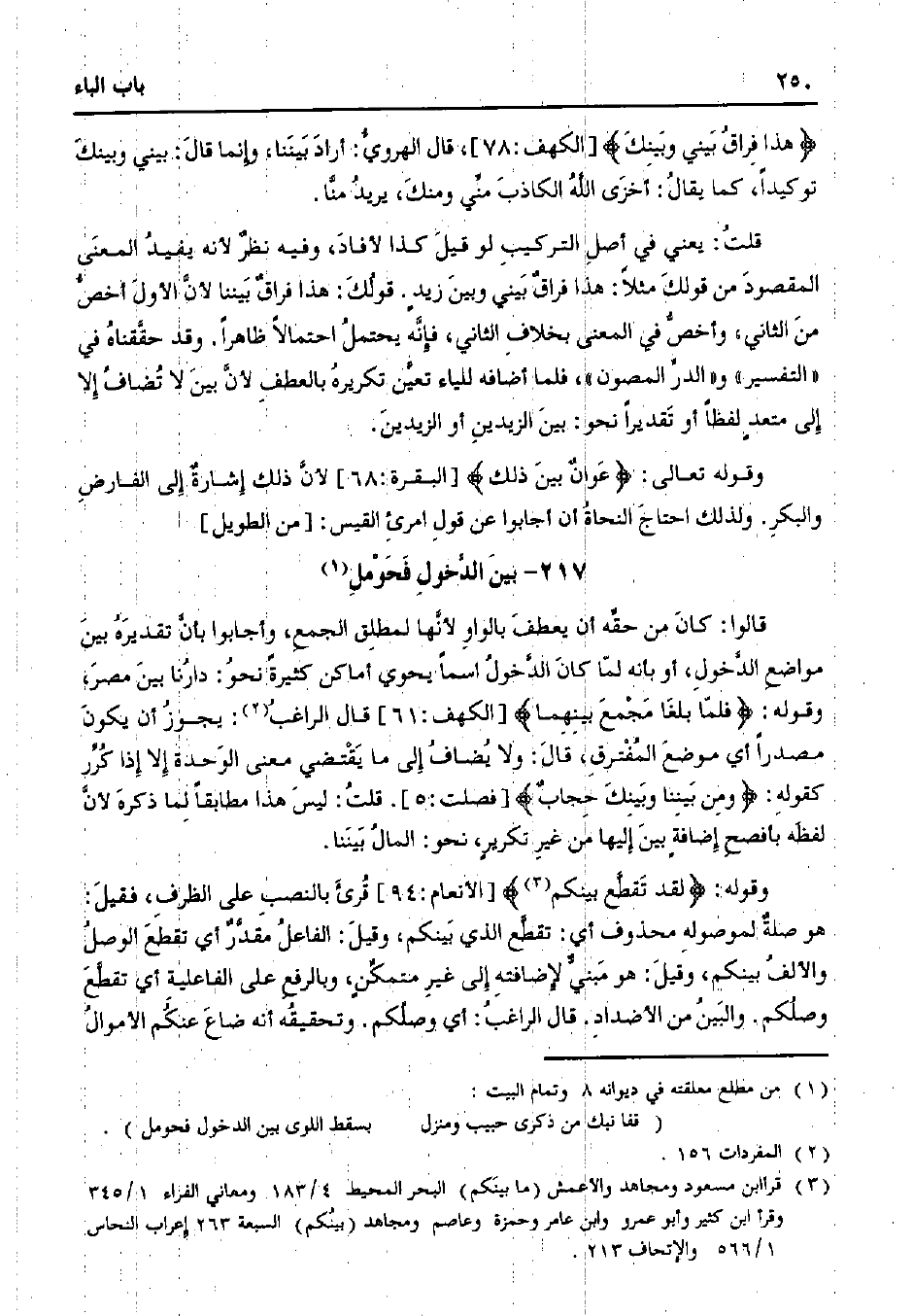قالوا: كان من حقه أن يعطف بالواو لأنها لمطلق الجمع، وأجابوا بأن تقديره بين مواضع الدخول، أو بأنه لما كان الدخول اسمًا يحوي أماكن كثيرًة نحو: دارنا بين مصر، وقوله:} فلما بلغا مجمع بينهما {[الكهف: 61] قال الراغب: يجوز أن يكون مصدرًا أي موضع المفترق، قال: ولا يضاف إلى ما يقتضي معنى الوحدة إلا إذا كرر كقوله:} ومن بيننا وبينك حجاب {[فصلت: 5]. قلت: ليس هذا مطابقًا لما ذكره لأن لفظه بأفصح إضافة بين إليها من غير تكريرٍ، نحو: المال بيننا.