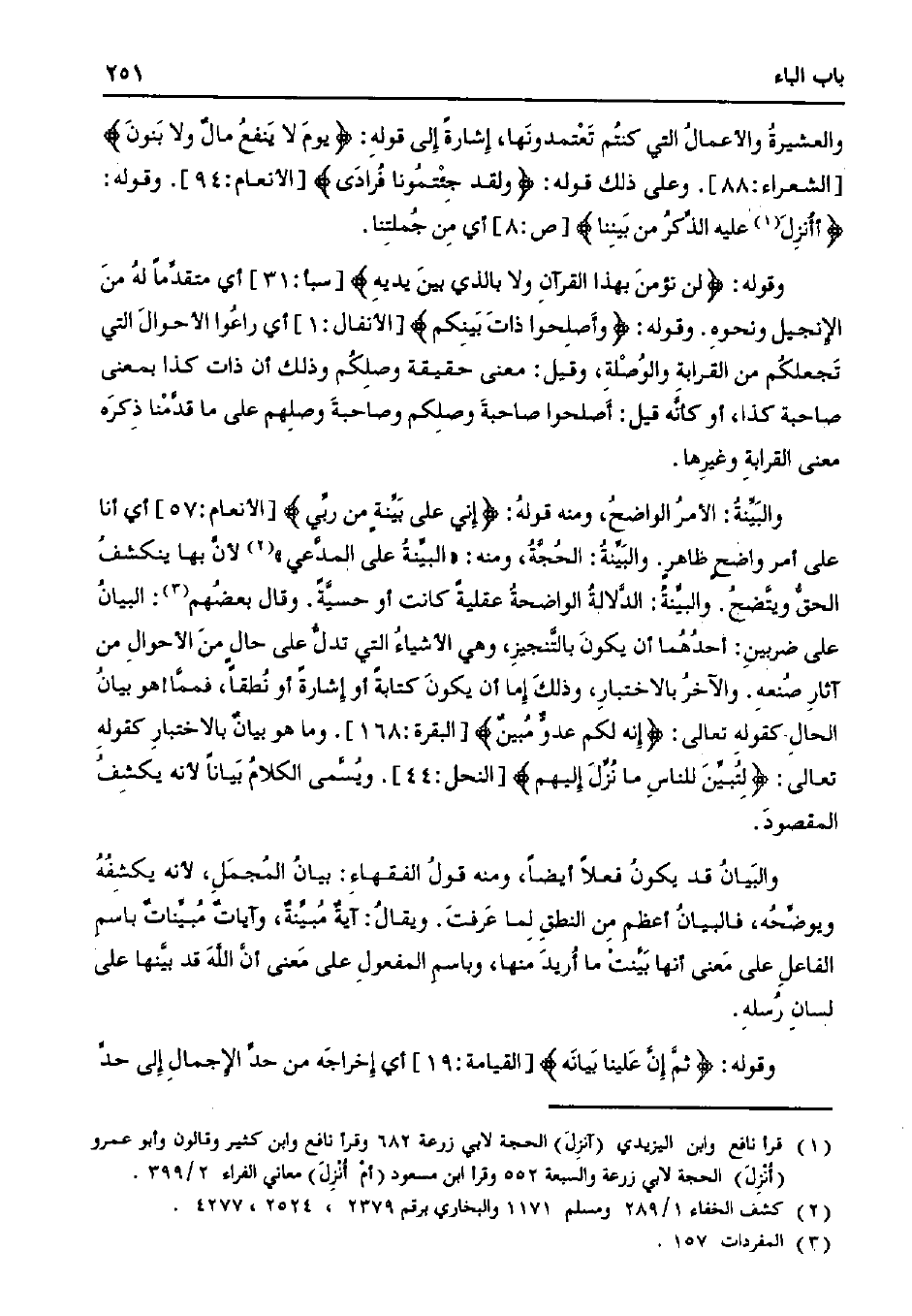 والبيان قد يكون فعلاً أيضًا، ومنه قول الفقهاء: بيان المجمل، لأنه يكشفه ويوضحه، فالبيان أعظم من النطق لما عرفت. ويقال: آية مبينة، وآيات مبينات باسم الفاعل على معنى أنها بينت ما أريد منها، وباسم المفعول على معنى أن الله قد بينها على لسان رسله.