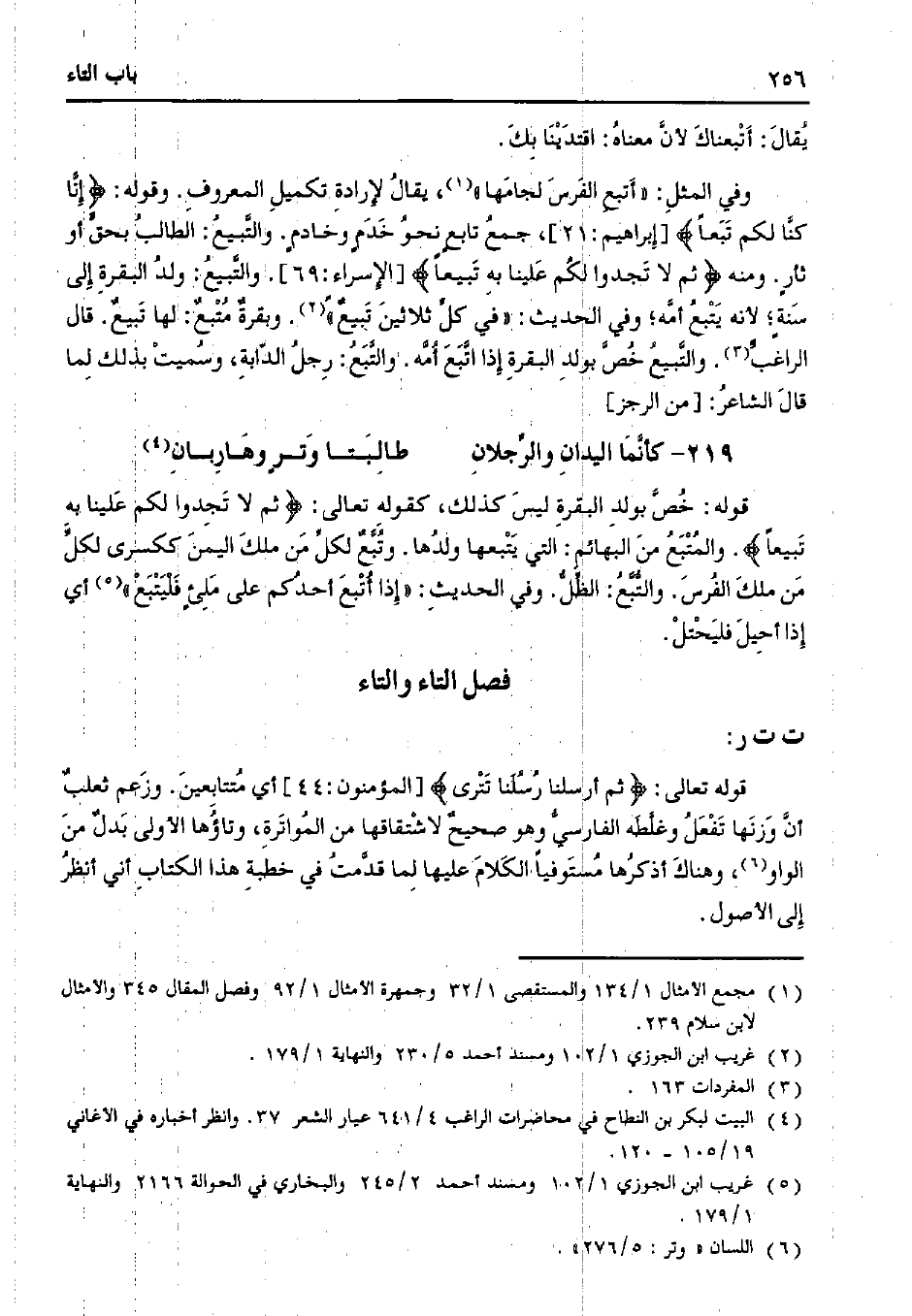 وفي المثل: «أتبع الفرس لجامها»، يقال لإرادة تكميل المعروف. وقوله: {إنا كنا لكم تبعًا} [إبراهيم: 21]، جمع تابع نحو خدمٍ وخادمٍ. والتبيع: الطالب بحق أو ثأر. ومنه {ثم لا تجدوا لكم علينا به تبيعًا} [الإسراء: 69]. والتبيع: ولد البقرة إلى سنةٍ؛ لأنه يتبع أمه؛ وفي الحديث «في كل ثلاثين تبيعٌ». وبقرةٌ متبعٌ: لها تبيعٌ. قال الراغب. والتبيع خص بولد البقرة إذا اتبع أمه. والتبع: رجل الدابة، وسميت بذلك لما قال الشاعر: [من الرجز]