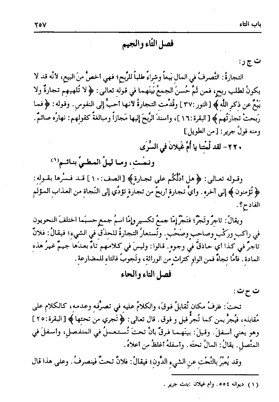ويقال: تاجرٌ وتجرٌ؛ فتجرٌ إما جمع تكسير وإما اسم جمعٍ حسبما اختلف النحويون في راكبٍ وركبٍ وصاحبٍ وصحبٍ. وتستعار التجارة للحذق في الشيء؛ فيقال: فلانٌ تاجرٌ في كذا أي حاذقٌ في وجوهٍ. قالوا: وليس في كلامهم تاءٌ بعدها جيمٌ غير هذه المادة. فأما تجاهٌ فمن الواو كتراثٍ من الوراثة، وتجوب فالتاء للمضارعة.