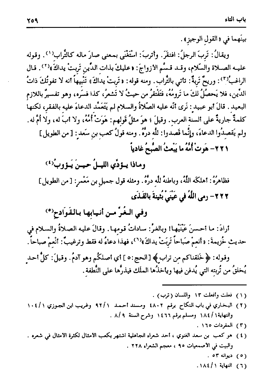 ويقال: ترب الرجل: افتقر. وأترب: استغنى بمعنى صار ماله كالتراب. وقوله عليه الصلاة والسلام، وقد قسم الأزواج: «عليك بذات الدين تربت يداك». قال الراغب. وريحٌ تربةٌ: تأتي بالتراب. ومنه قوله: «تربت يداك» تنبيهًا أنه لا تفوتك ذات الدين، فلا يحصل لك ما ترومه، فتفتقر من حيث لا تشعر، كذا فسره، وهو تفسيرٌ باللازم البعيد. قال أبو عبيد: نرى أنه عليه الصلاة والسلام لم يتعمد الدعاء عليه بالفقر، لكنها كلمة جاريةٌ على ألسنة العرب. وقيل؛ هو مثل قولهم: هوت أمه، ولا أب له، ولا أم له. ولم يقصدوا الدعاء، وإنما قصدوا: لله دره. ومنه قول كعب بن سعدٍ: [من الطويل]