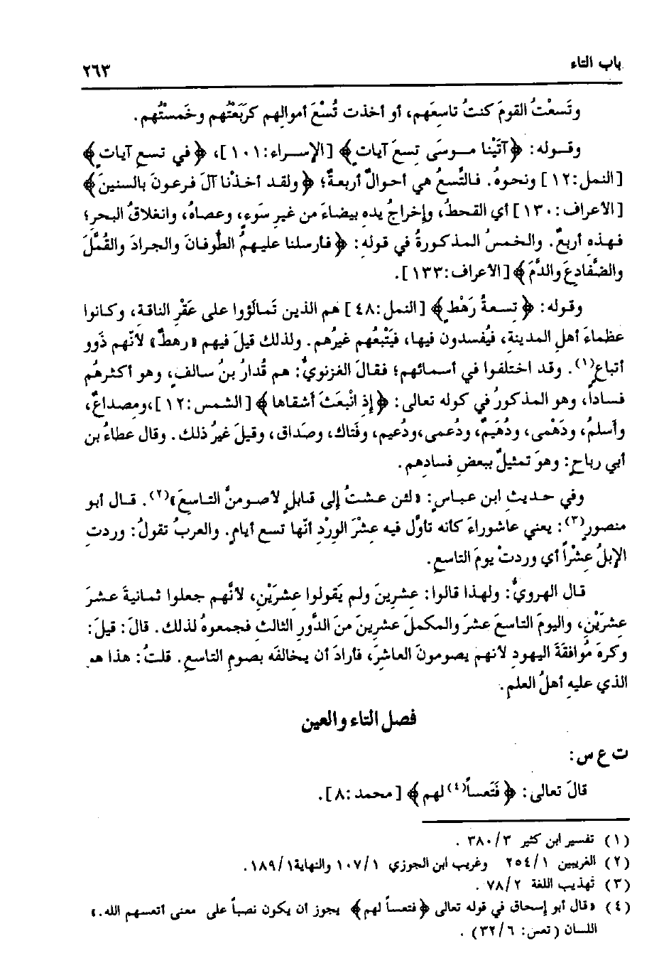 وقوله: {أتينا موسى تسع آيات} [الإسراء: 101]، {في تسع آيات} [النمل: 12] ونحوه. فالتسع هي أحوالٌ أربعةٌ؛ {ولقد أخذنا آل فرعون بالسنين} [الأعراف: 130] أي القحط، وإخراج يده بيضاء من غير سوء، وعصاه، وانغلاق البحر؛ فهذه أربعٌ. والخمس المذكورة في قوله: {فأرسلنا عليهم الطوفان والجراد والقمل والضفادع والدم} [الأعراف: 133].