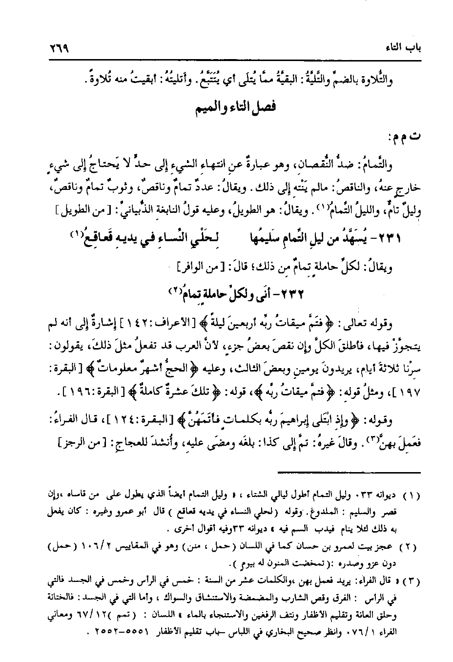 والتمام: ضد النقصان، وهو عبارة عن انتهاء الشيء إلى حد لا يحتاج إلى شيء خارج عنه، والناقص: ما لم ينته إلى ذلك. ويقال: عددٌ تمامٌ وناقصٌ، وثوبٌ تمامٌ وناقصٌ، وليل تام، والليل التمام. ويقال: هو الطويل، عليه قول النابغة الذبياني: [من الطويل]