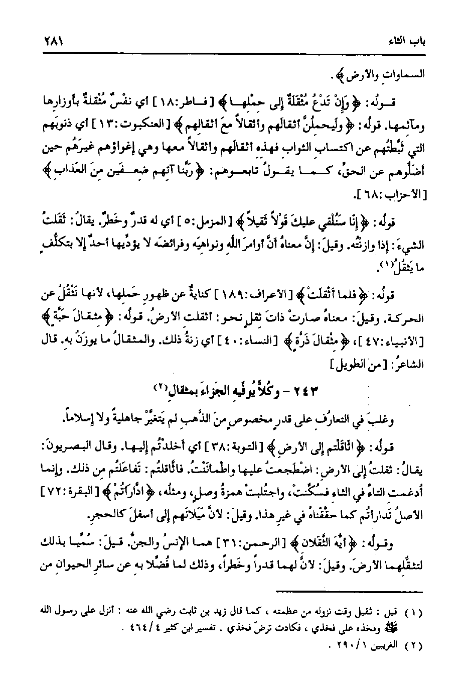قوله: {وإن تدع مثقلةٌ إلى حملها} [فاطر: 18] أي نفسٌ مثقلةٌ بأوزارها ومآثمها. قوله: {وليحملن أثقالهم وأثقالًا مع أثقالهم} [العنكبوت: 13] أي ذنوبهم التي ثبطتهم عن اكتساب الثواب فهذه أثقالهم وأثقالًا معها وهي أغواؤهم غيرهم حين أضلوهم عن الحق، كما يقول تابعوهم: {ربنا آتهم ضعفين من العذاب} [الأحزاب: 68].