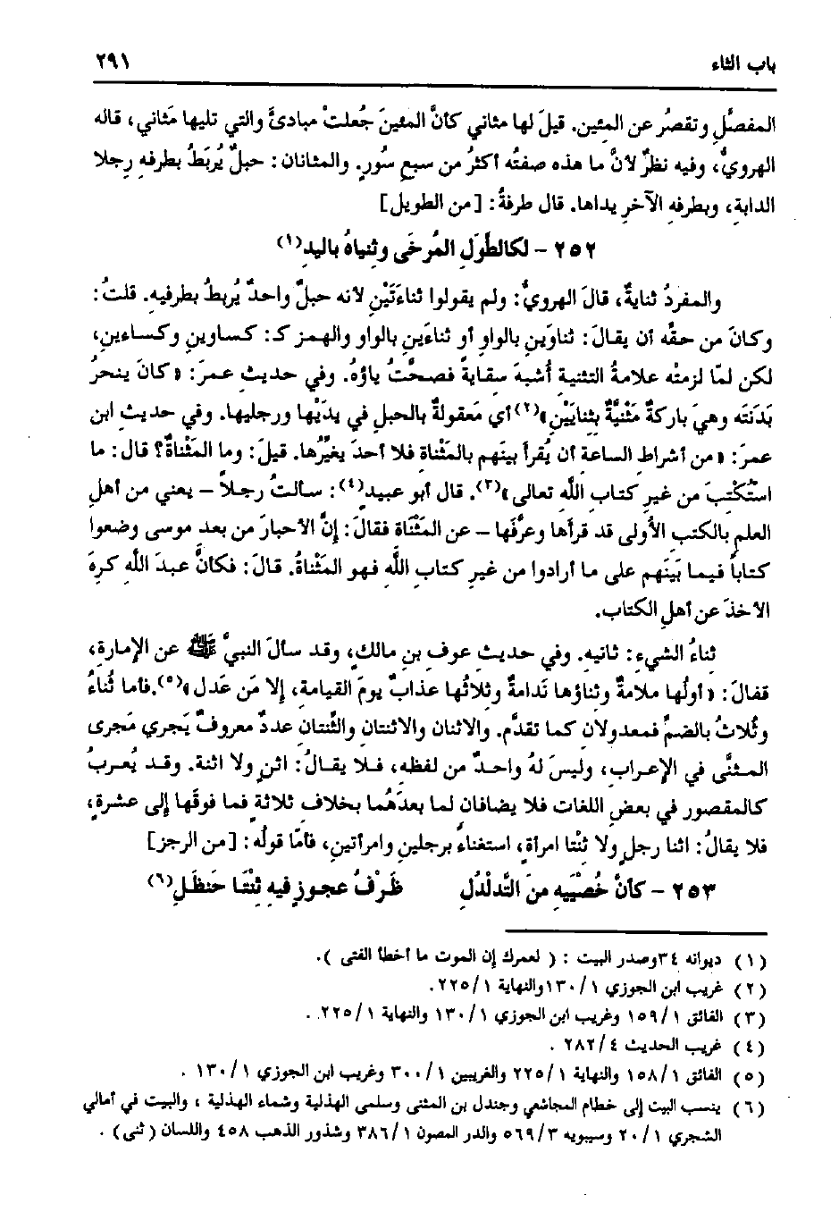 والمفرد ثنايةٌ، قال الهروي: ولم يقولوا ثناءتين لأنه حبلٌ واحدٌ يربط بطرفيه. قلت: وكان من حقه أن يقال: ثناوين بالواو أو ثناءين بالواو والهمز كـ: كساوين وكساءين، لكن لما لزمته علامة التثنية أشبه سقايةً فصحت ياؤه. وفي حديث عمر: «كان ينحر بدنته وهي باركةٌ مثنيةٌ بثنايين» أي معقولةٌ بالحبل في يديها ورجليها. وفي حديث ابن عمر: «من أشراط الساعة أن يقرأ بينهم بالمثناة فلا أحد يغيرها. قيل: وما المثناةٌ؟ قال: ما استكتب من غير كتاب الله تعالى». قال أبو عبيد: سألت رجلًا -يعني من أهل العلم بالكتب الأولى قد قرأها وعرفها -عن المثناة فقال: إن الأحبار من بعد موسى وضعوا كتابًا فيما بينهم على ما أرادوا من غير كتاب الله فهو المثناة. قال: فكأن عبد الله كره الأخذ عن أهل الكتاب.