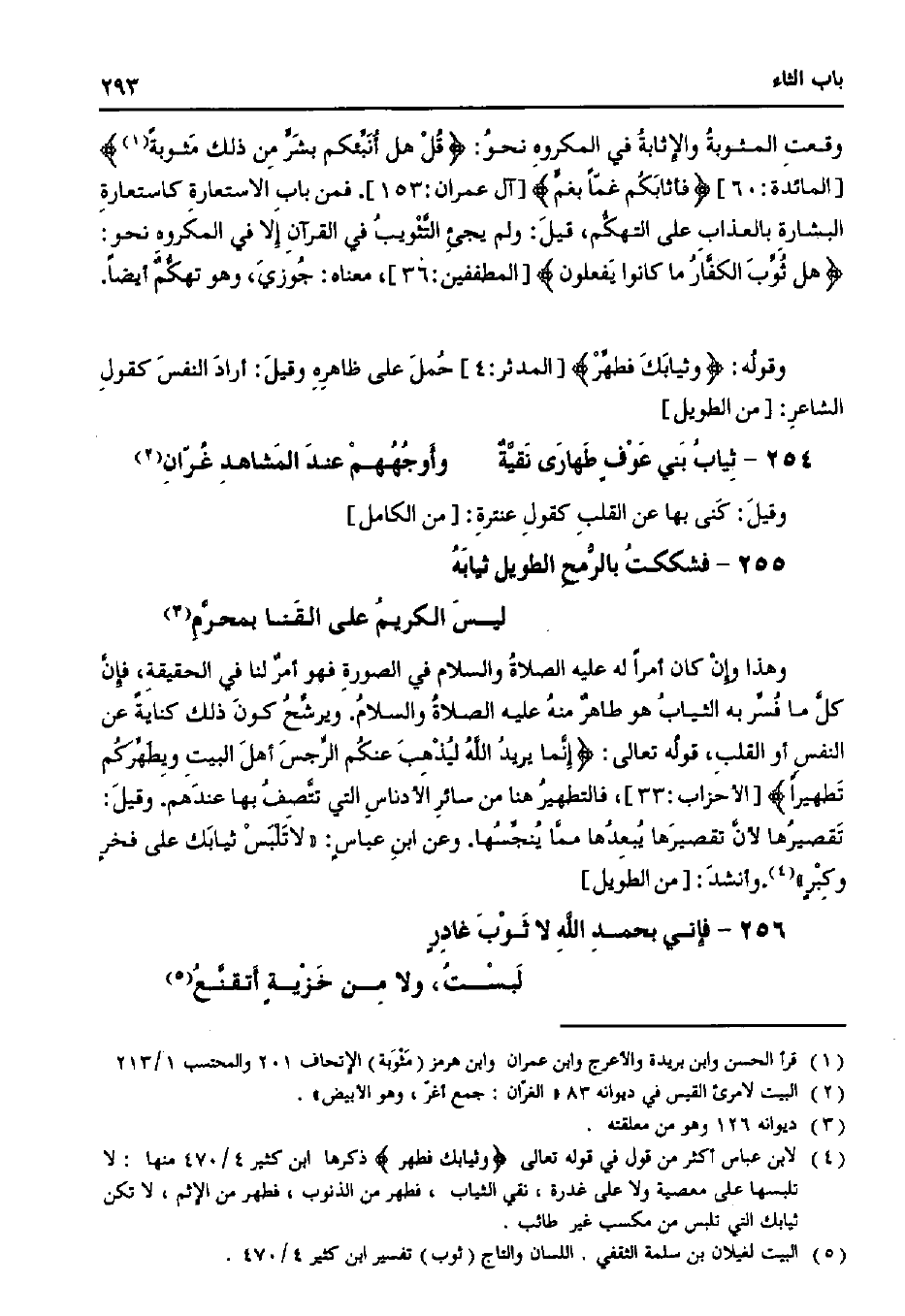 وهذا وإن كان أمرًا له عليه الصلاة والسلام في الصورة فهو أمرٌ لنا في الحقيقة، فإن كل ما فسر به الثياب هو طاهرٌ منه عليه الصلاة والسلام. ويرشح كون ذلك كنايةً عن النفس أو القلب، قوله تعالى: {إنما يريد الله ليذهب عنكم الرجس أهل البيت ويطهركم تطهيرًا} [الأحزاب: 33]، فالتطهير هنا من سائر الأدناس التي تتصف بها عندهم. وقيل: تقصيرها لأن تقصيرها يبعدها مما ينجسها. وعن ابن عباس: «لا تلبس ثيابك على فخرٍ وكبر». وأنشد: [من الطويل]