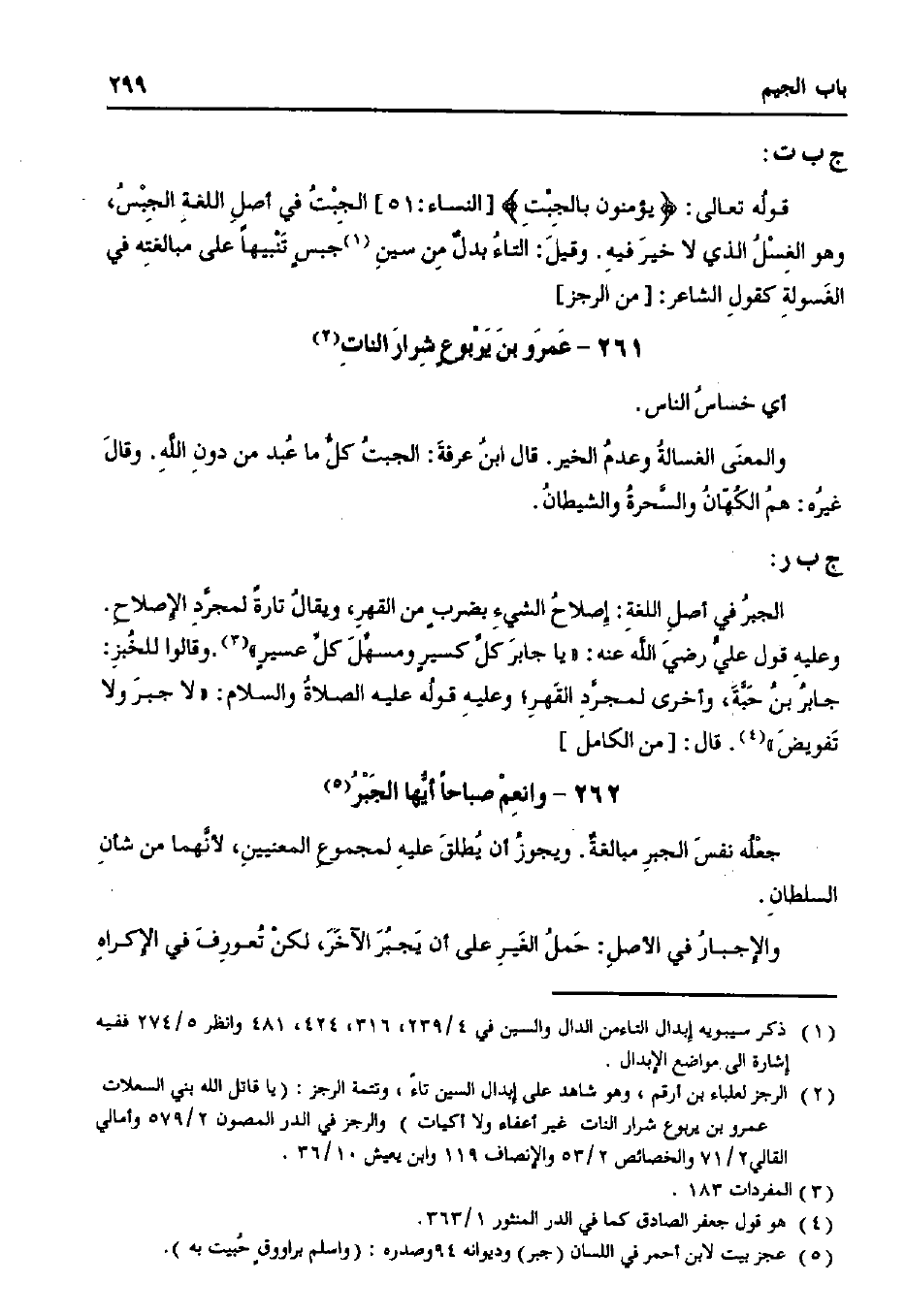 قوله تعالى: {يؤمنون بالجبت} [النساء: 51] الجبت في أصل اللغة الجبس، وهو الغسل الذي لا خير فيه. وقيل: التاء بدل من سين جبسٍ تنبيهًا على مبالغته في الغسولة كقول الشاعر: [من الرجز]