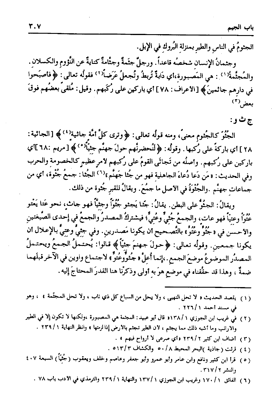 ويقال: الجثو على البطن. يقال: جثا يجثو جثوًا وجثيًا فهو جاثٍ، نحو عتا يعتو عتوًا وعتيًا فهو عات، والجمع جثى وعتي؛ فيشترك المصدر والجمع في إحدى الصيغتين والأحسن في "جثو وعتو" بالتصحيح أن يكونا مصدرين. وفي جثي وعتي بالإعلال أن يكونا جمعين. وقوله تعالى: {حول جهنم جثيًا} قالوا: يحتمل الجمع ويحتمل المصدر الموضوع موضع الجمل، إنما أعل "جثو وعتو" لاجتماع واوين في الآخر قبلهما ضمة، وهذا قد حققناه في موضع هو به أولى وذكرنا هنا القدر المحتاج إليه.