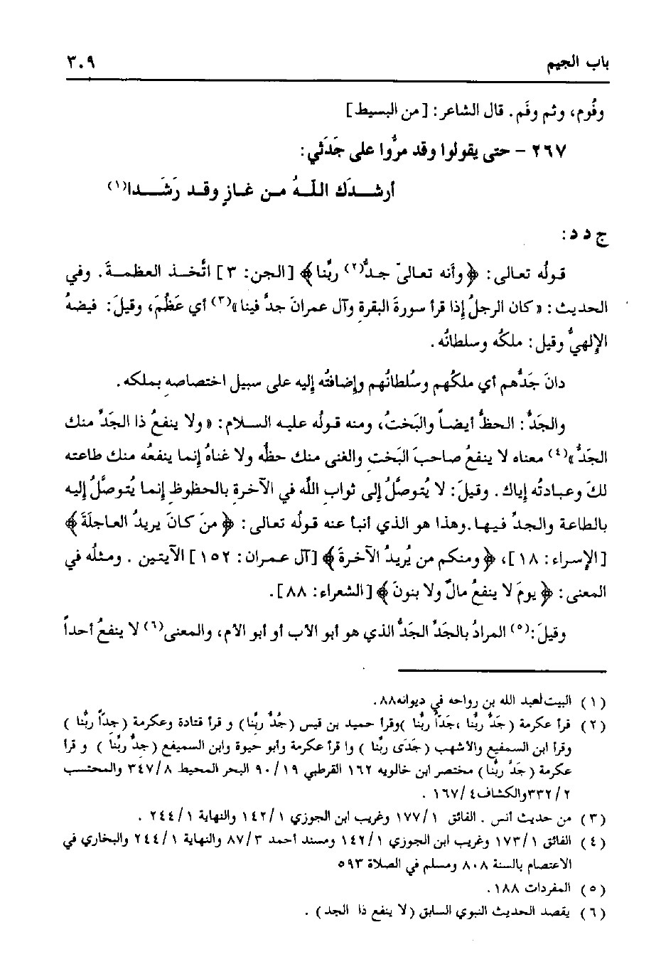 والجد: الحظ أيضًا والبخت، ومنه قوله عليه السلام: "ولا ينفع ذا الجد منك الجد" معناه لا ينفع صاحب البخث والغنى منك حظه ولا غناه إنما ينفعه منك طاعته لك وعبادته إياك. وقيل: لا يتوصل إلى ثواب الله في الآخرة بالحظوظ إنما يتوصل إليه بالطاعة الجد فيها. وهذا هو الذي أنبأ عنه قوله تعالى: {من كان يريد العاجلة} [الإسراء: 18]، {ومنكم من يريد الآخرة} [آل عمران: 152] الآيتين. ومثله في المعنى: {يوم لا ينفع مال ولا بنون} [الشعراء: 88].