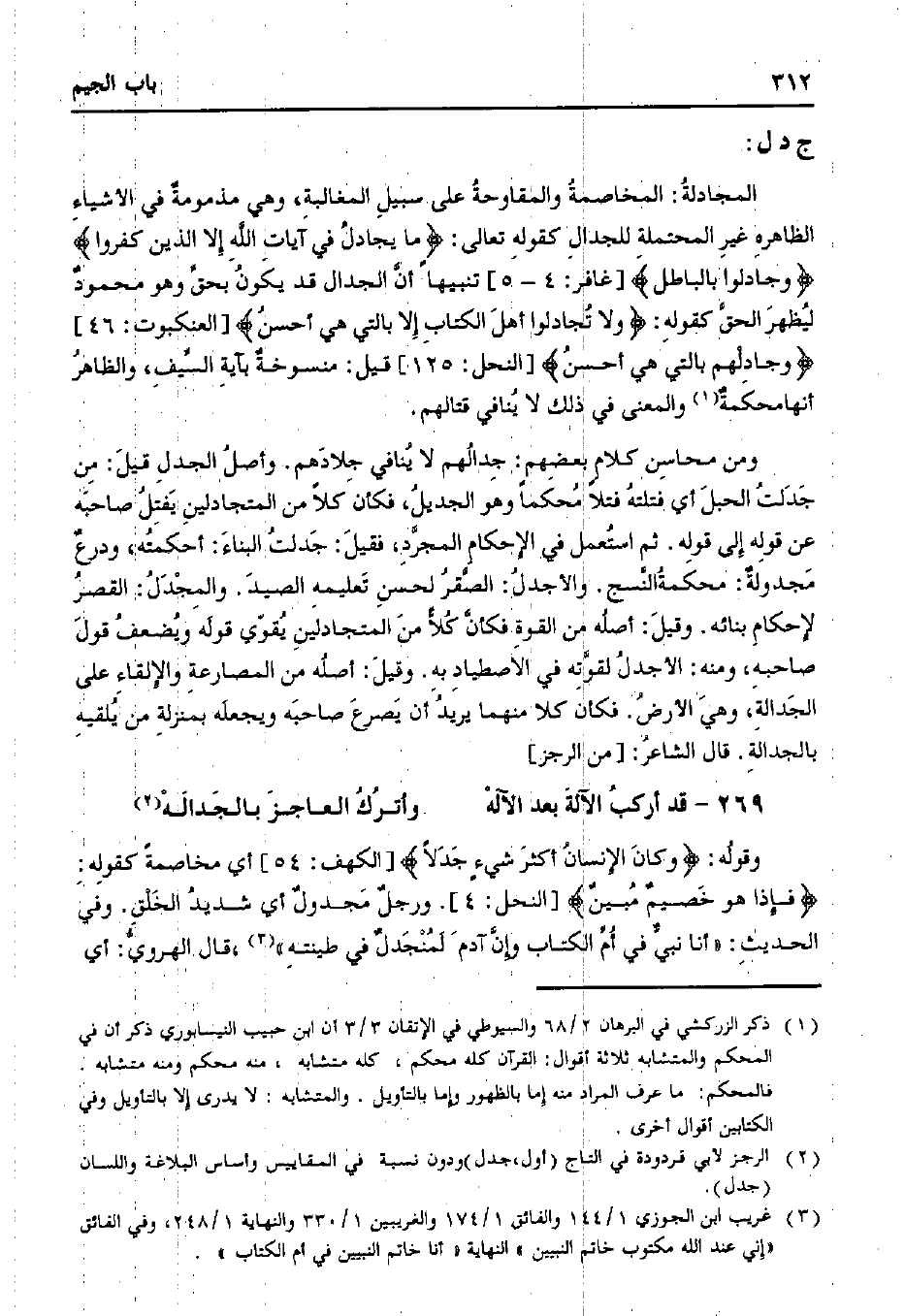 المجادلة: المخاصمة والمقاوحة على سبيل المغالبة، وهي مذمومة في الأشياء الظاهرة غير المحتملة للجدال كقوله تعالى: {ما يجادل في آيات الله إلا الذين كفروا} {وجادلوا بالباطل} [غافر: 4 - 5] تنبيهًا أن الجدال قد يكون بحق وهو محمود ليظهر الحق كقوله: {ولا تجادلوا أهل الكتاب إلا بالتي هي أحسن} [العنكبوت: 46] {وجادلهم بالتي هي أحسن} [النحل: 125] قيل: منسوخة بآية السيف، والظاهر أنها محكمة والمعنى في ذلك لا ينافي قتالهم.