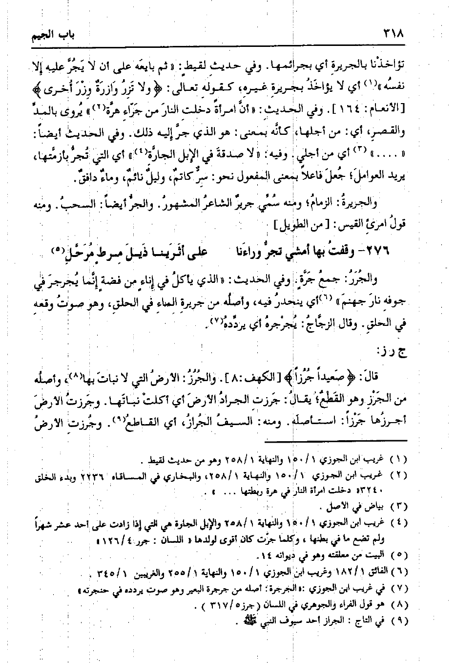 تؤاخذنا بالجريرة أي بجرائمها. وفي حديث لقيطٍ: "ثم بايعه على أن لا يجر عليه إلا نفسه" أي لا يؤاخذ بجريرة غيره، كقوله تعالى: {ولا تزر وازرة وزر أخرى} [الأنعام: 164]. وفي الحديث: "أن امرأة دخلت النار من جراء هرة" يروى بالمد والقصر، أي: من أجلها، كأنه بمعنى: هو الذي جر إليه ذلك. وفي الحديث أيضًا: " ... " أي من أجلي. وفيه: "لا صدقة في الإبل الجارة" أي التي تجر بأزمتها، يريد العوامل؛ جعل فاعلاً بمعنى المفعول نحو: سر كاتم، وليل نائم، وماء دافق.