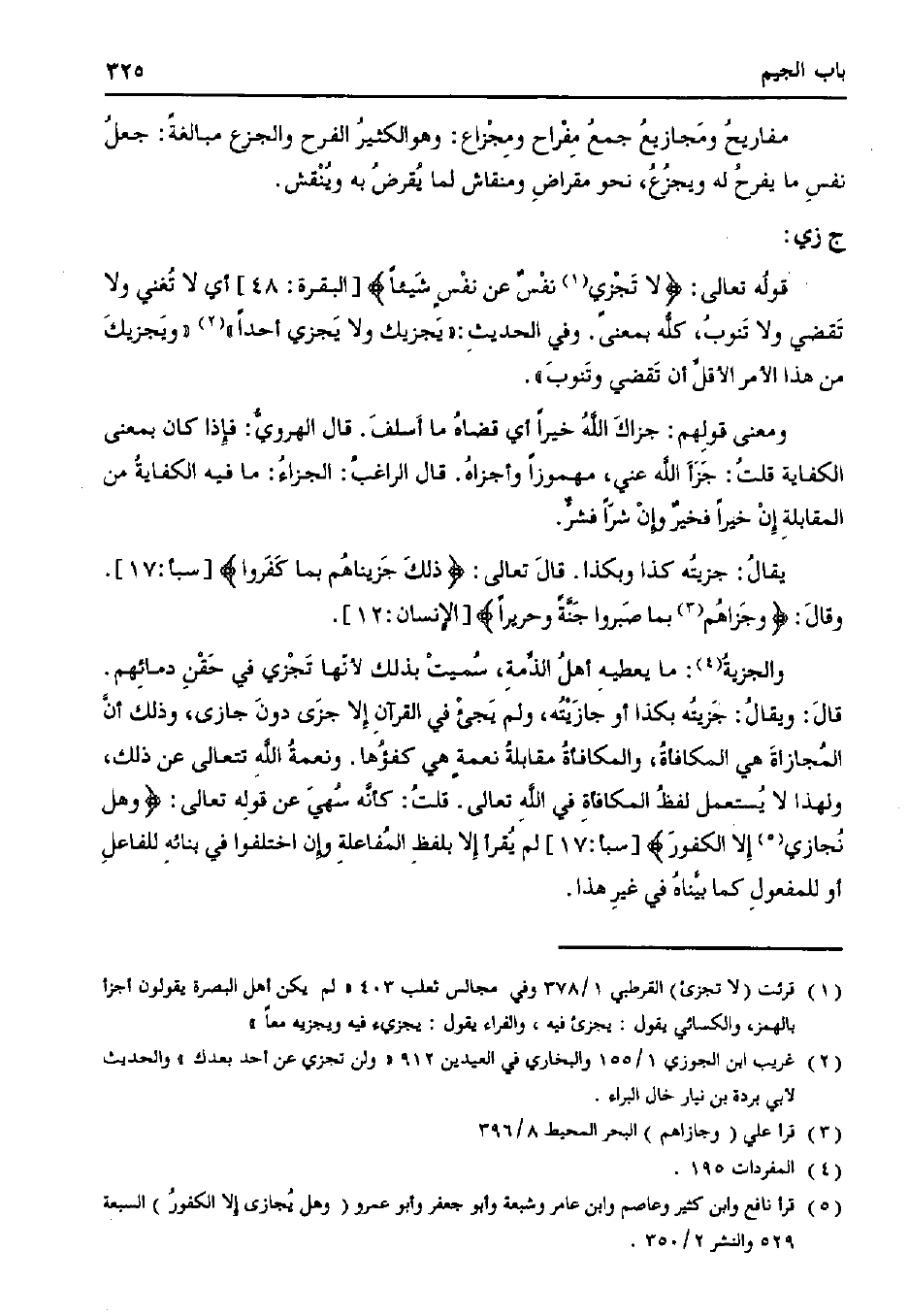 والجزية: ما يعطيه أهل الذمة، سميت بذلك لأنها تجزي في حقن دمائهم. قال: ويقال: جزيته بكذا أو جازيته، ولم يجيء في القرآن إلا جزى دون جازى، وذلك أن المجازاة هي المكافأة، والمكافأة مقابلة نعمةٍ هي كفؤها. ونعمة الله تتعالى عن ذلك، ولهذا لا يستعمل لفظ المكافأة في الله تعالى. قلت: كأنه سهي عن قوله تعالى: {وهل نجازي إلا الكفور} [سبأ: 17] لم يقرأ إلا بلفظ المفاعلة وإن اختلفوا في بنائه للفاعل أو للمفعول كما بيناه في غير هذا.