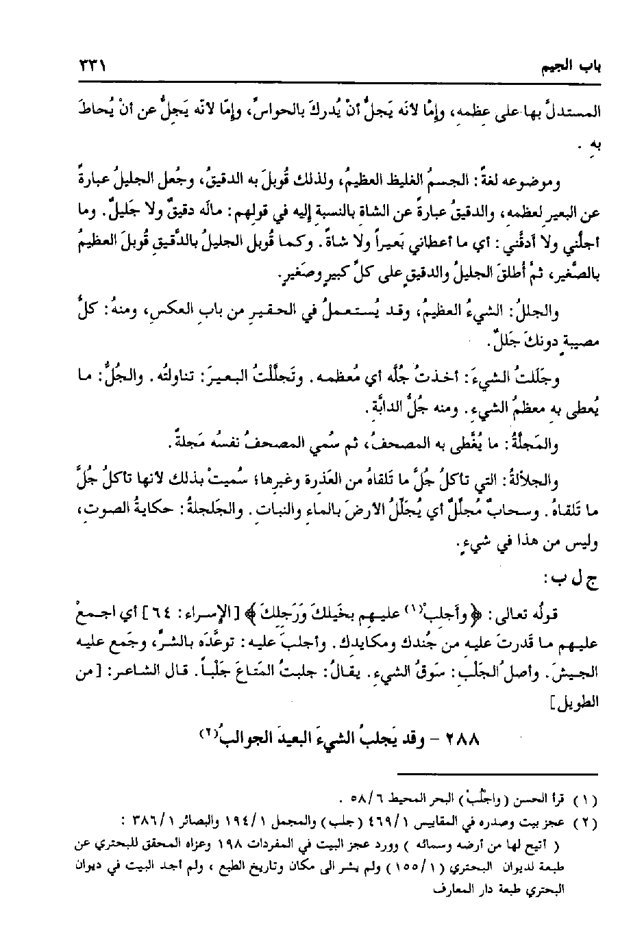 والجلالة: التي تأكل جل ما تلقاه من العذرة وغيرها؛ سميت بذلك لأنها تأكل جل ما تلقاه. وسحاب مجلل أي يجلل الأرض بالماء والنبات. والجلجلة: حكاية الصوت، وليس من هذا في شيء.