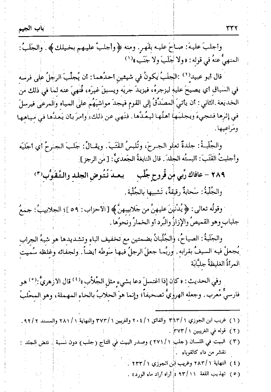 وفي الحديث: "كان إذا اغتسل دعا بشيءٍ مثل الجلاب" قال الأزهري: هو فارسي معرب. وجعله الهروي تصحيفًا، وإنما هو الحلاب بالحاء المهملة، وهو المحلب