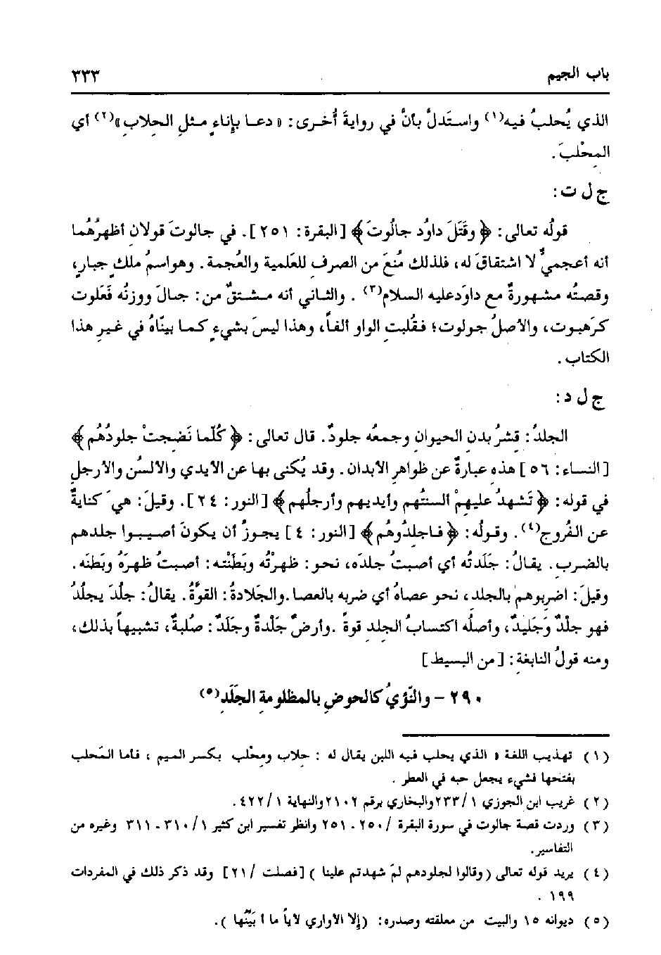 قوله تعالى: {وقتل داود جالوت} [البقرة: 251]. في جالوت قولان أظهرهما أنه أعجمي لا اشتقاق له، فلذلك منع من الصرف للعلمية والعجمة. وهو اسم ملكٍ جبارٍ، وقصته مشهورة مع داود عليه السلام. والثاني أنه مشتق من: جال ووزنه فعلوت كرهبوت، والأصل جولوت؛ فقلبت الواو ألفًا، وهذا ليس بشيءٍ ما بيناه في غير هذا الكتاب.