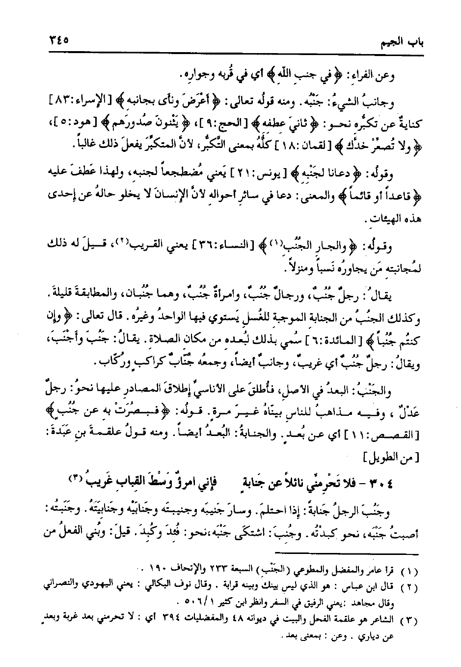 والجنب: البعد في الأصل، فأطلق على الأناسي إطلاق المصادر عليها نحو: رجل عدل، وفيه مذاهب للناس بيناه غير مرةٍ. قوله: {فبصرت به عن جنبٍ} [القصص: 11] أي عن بعدٍ. والجنابة: البعد أيضًا. ومنه قول علقمة بن عبدة: [من الطويل].
