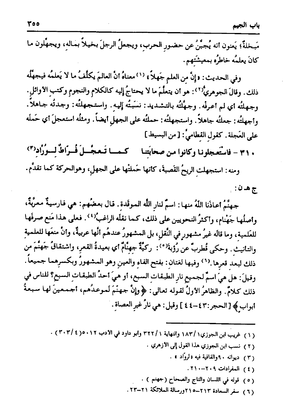 جهنم أعاذنا الله منها: اسم لنار الله الموقدة. قال بعضهم: هي فارسية معربة، وأصلها جهنام، وأكثر النحويين على ذلك، كما نقله الراغب. فعلى هذا منع صرفها للعلمية، وما قاله غير مشهور في النقل، بل المشهور عندهم أنها عربية، وأن منعها للعلمية والتأنيث. وحكى قطرب عن رؤبة: ركبة جهنام أي بعيدة القعر، واشتقاق جهنم من ذلك لبعد قعرها. وفيها لغتان: بفتح الفاء والعين وهو المشهور وبكسرهما جميعا.