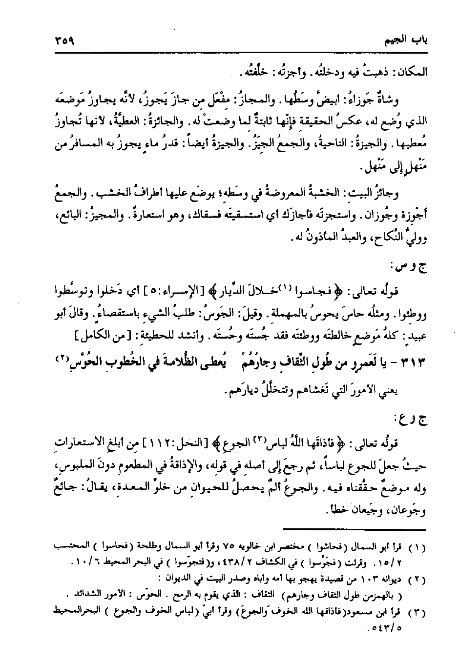 وشاة جوزاء: أبيض وسطها. والمجاز: مفعل من جاز يجوز، لأنه يجاوز موضعه الذي وضع له، عكس الحقيقة فإنها ثابتة لما وضعت له. والجائزة: العطية، لأنها تجاوز معطيها. والجيزة: الناحية، والجمع الجيز. والجيزة أيضًا: قدر ماء يجوز به المسافر من منهل إلى منهل.